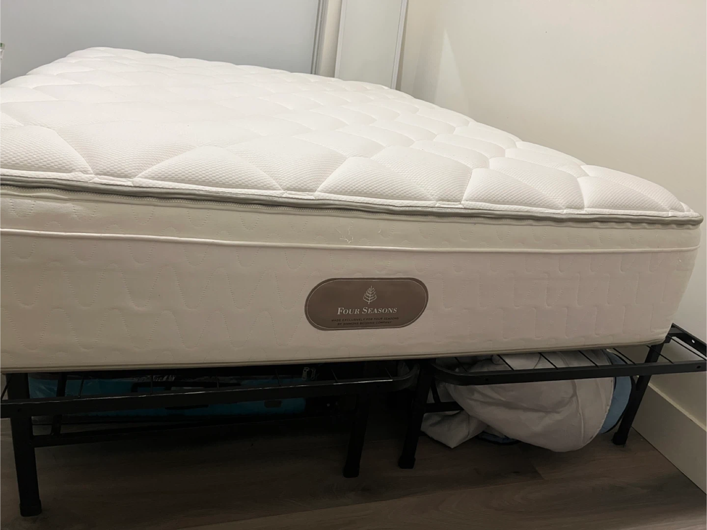 This is a Four Seasons mattress with a 12" thickness. It features a comfortable quilted top. It's suitable for a standard bed frame. Always had fully covered mattress protector on it. We bought it for over 2000$. Medium firm mattress. I can deliver for extra charge. No stains. Smoke free and pet free home.