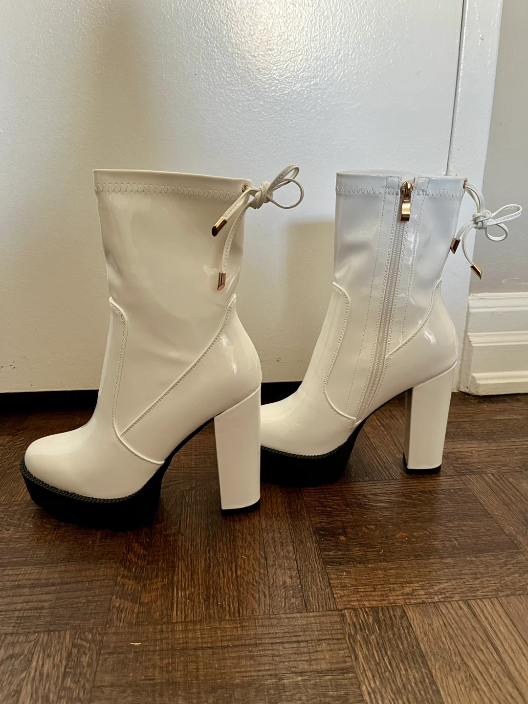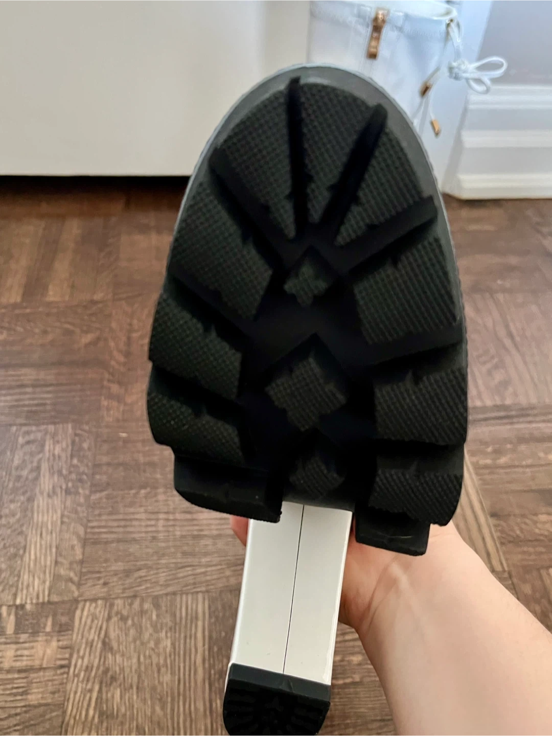 Size Euro 38 (US size 7). They fit quite wide. Nice rugged platform bottom for more stability. Selling because I bought them off another Karrot user, but they don’t zip up my calves. If you have thicker calves, they sadly won’t fit well. I have the box they came in too!