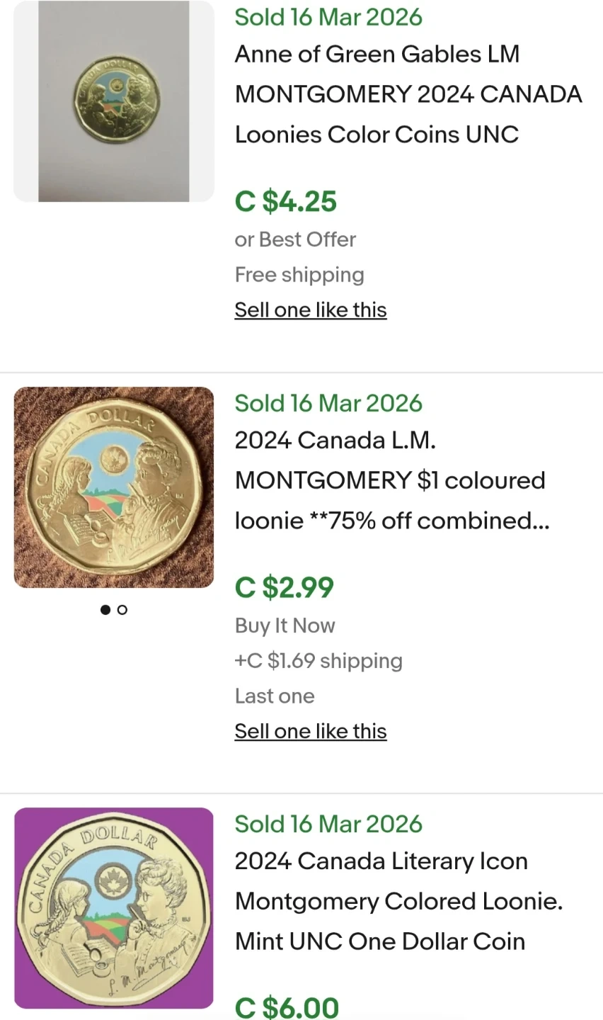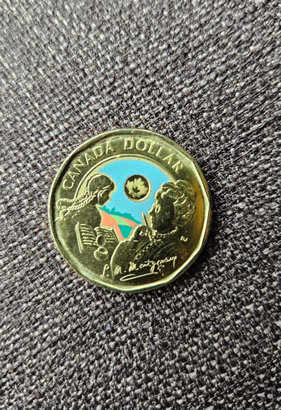 This is a 2024 Canadian one dollar coin featuring Lucy M. Montgomery, Anne of Green Gables author.