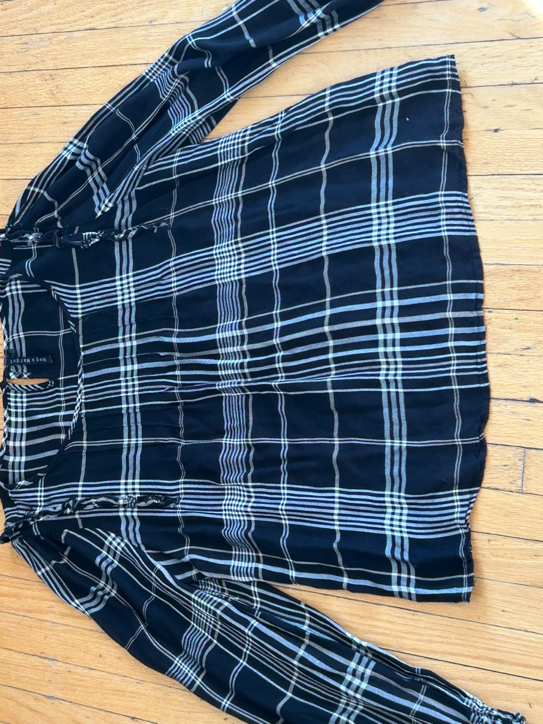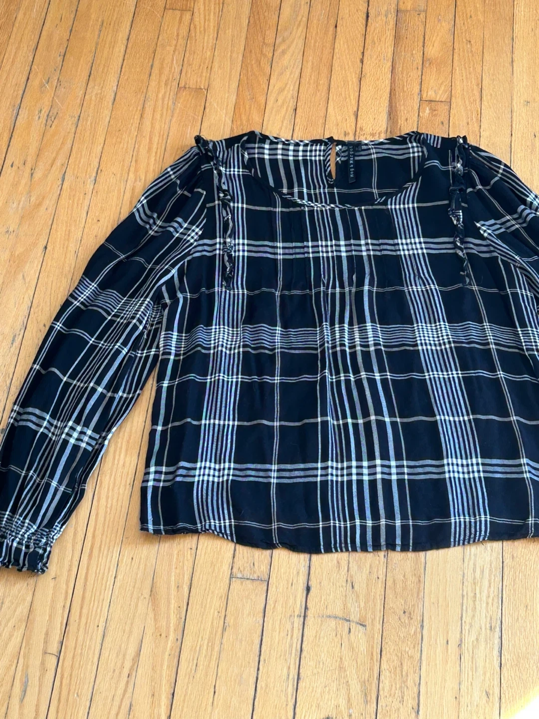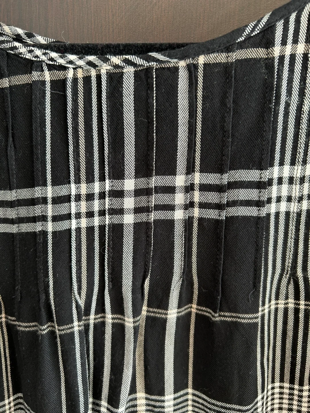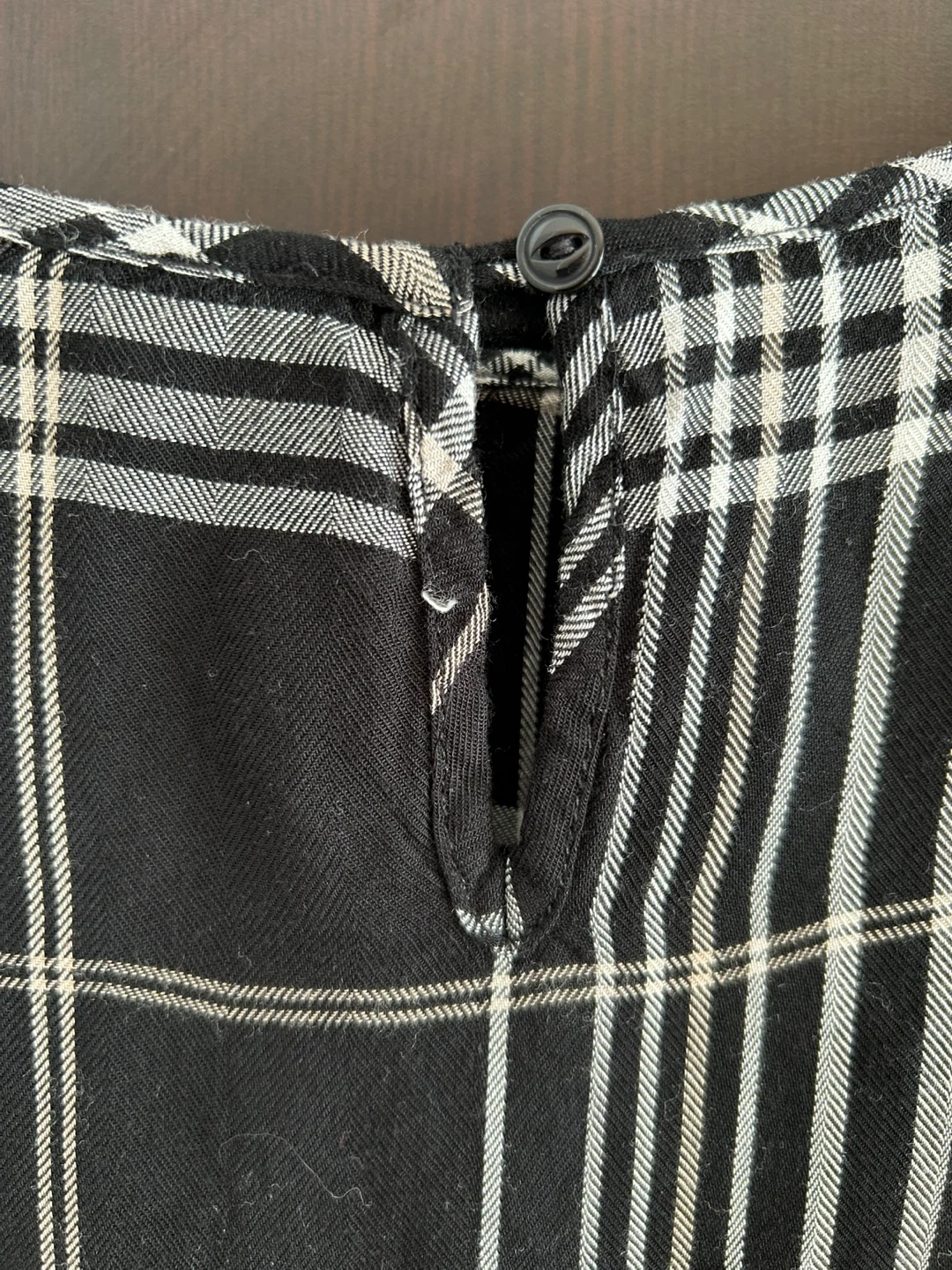 This Meg & Margot top is designed with a classic black and white plaid pattern. It features ruffled details along the neckline and elasticized cuffs. A button closure is present at the back of the neck. Made in Canada.