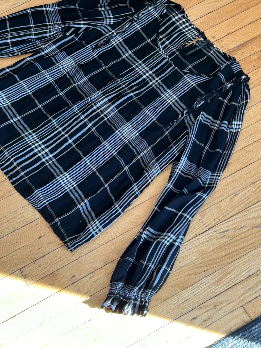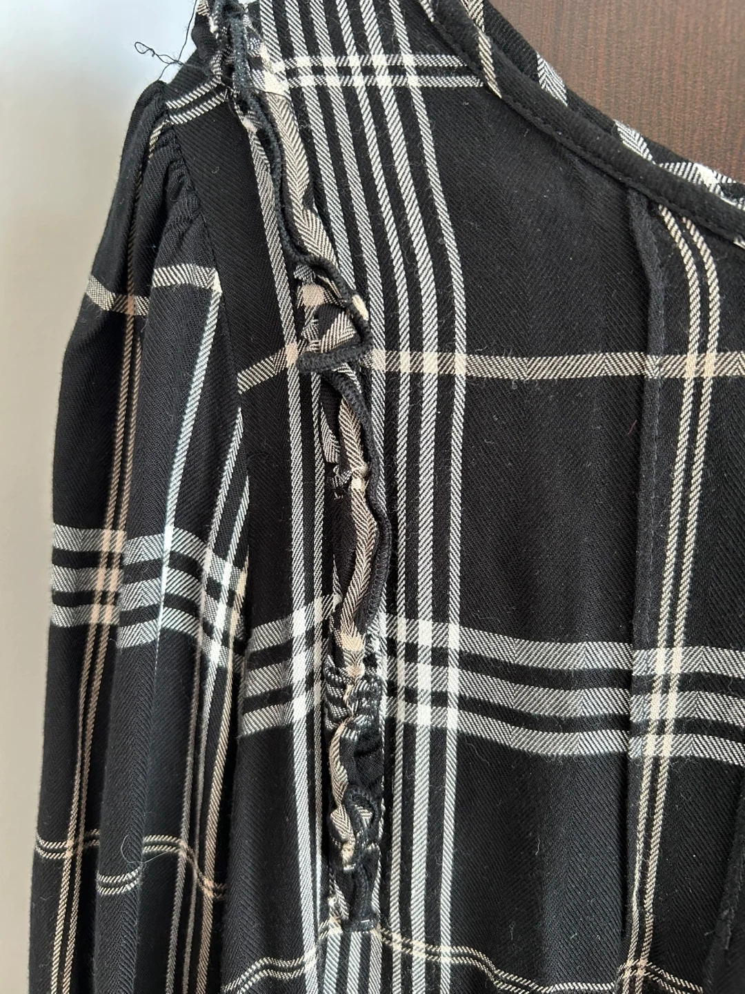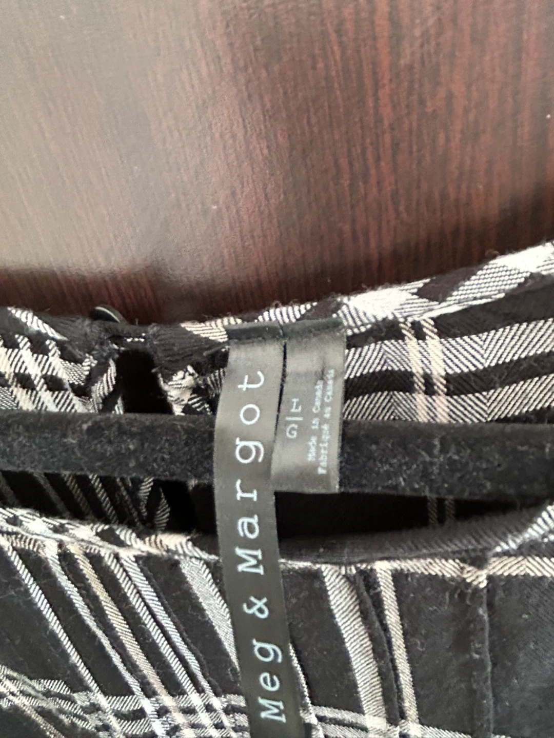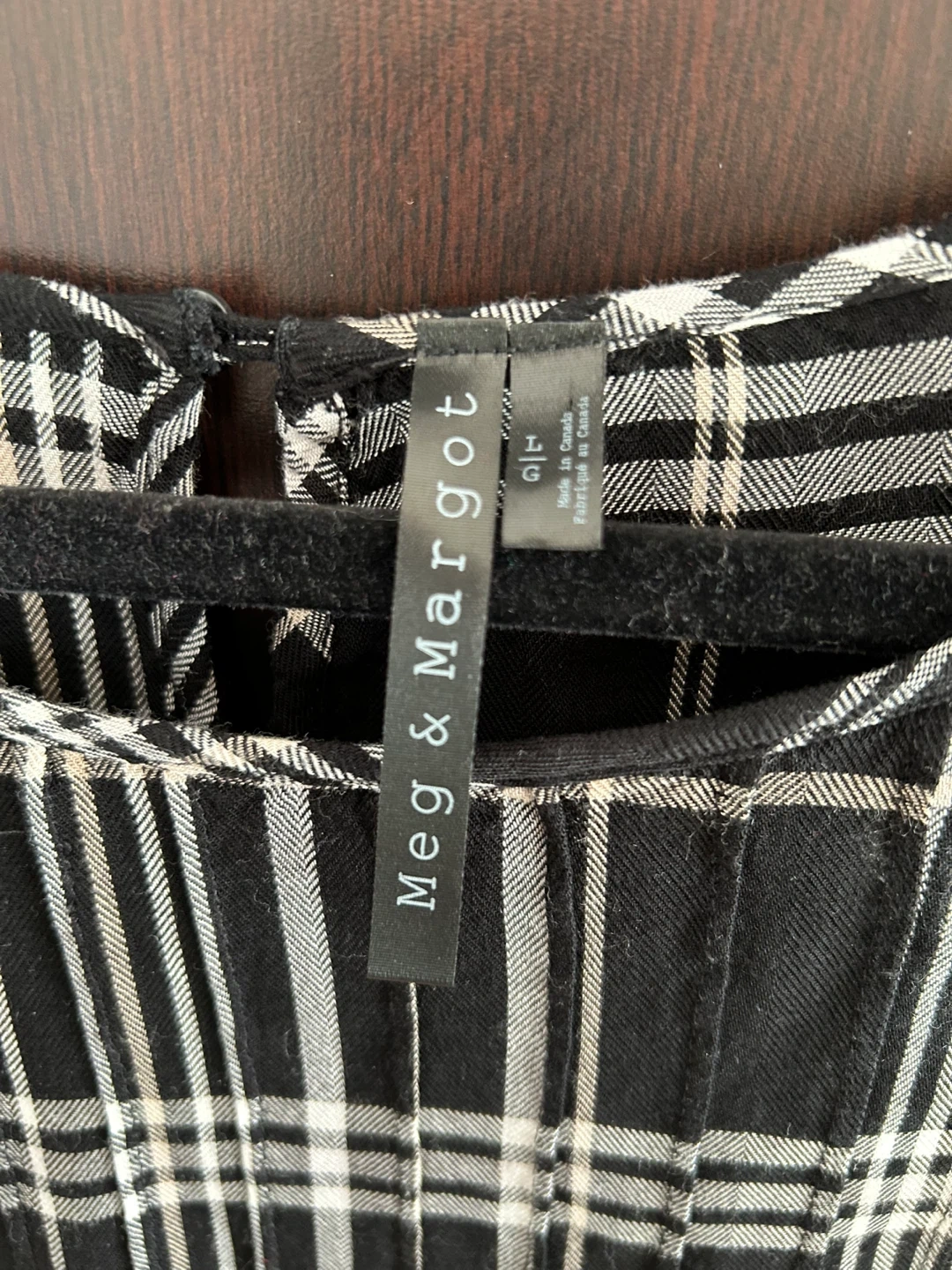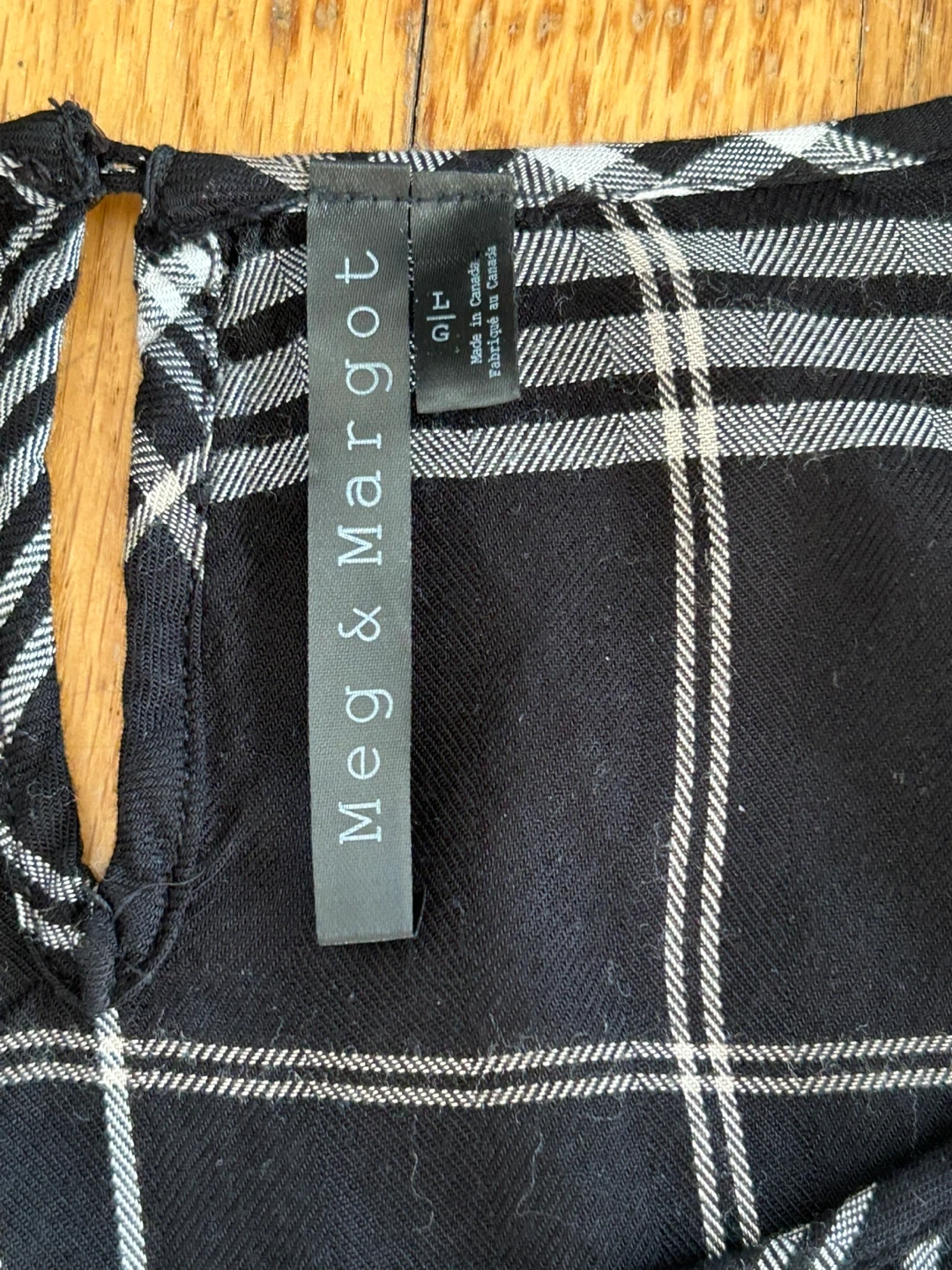 This Meg & Margot top is designed with a classic black and white plaid pattern. It features ruffled details along the neckline and elasticized cuffs. A button closure is present at the back of the neck. Made in Canada.
