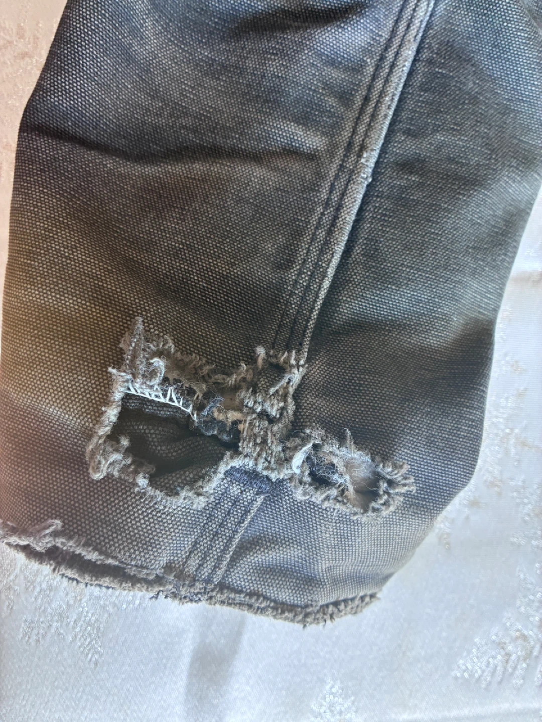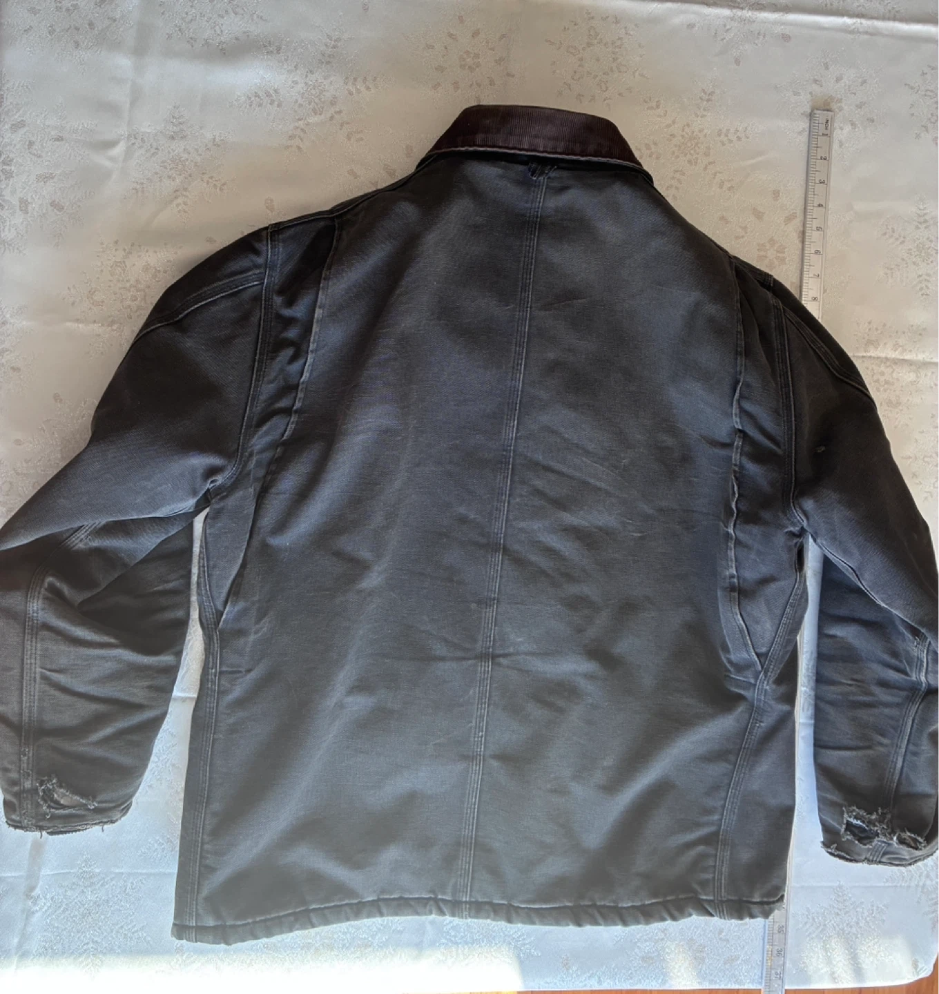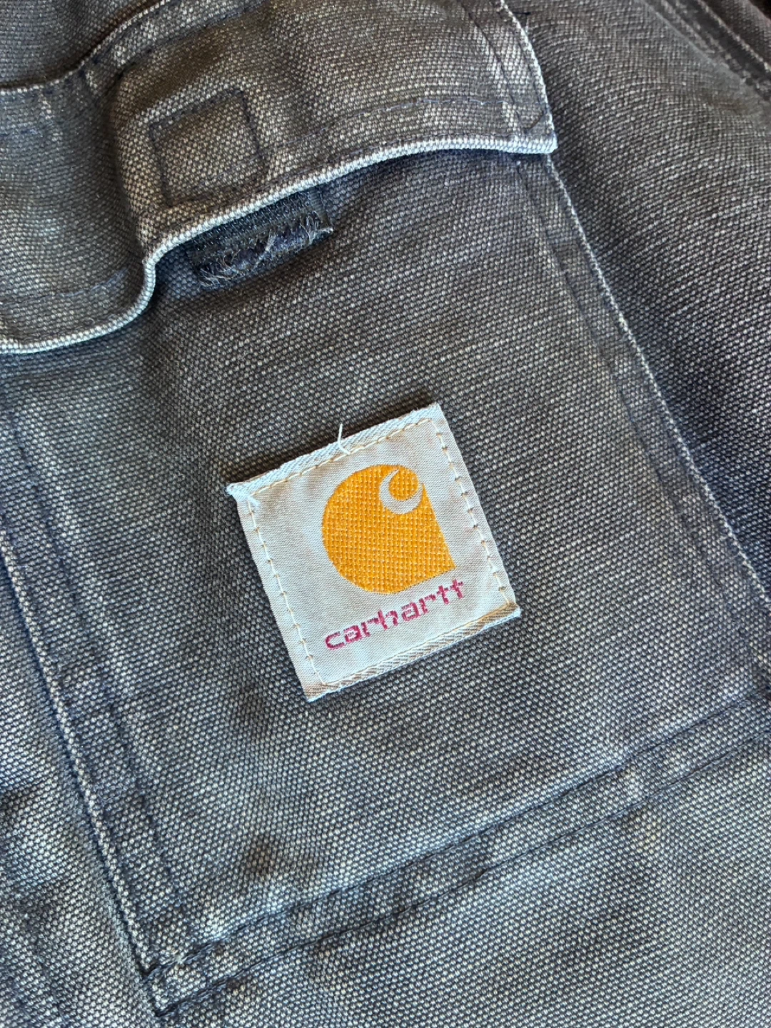 Carhartt work jacket in a dark grey colour. Features a corduroy collar and a full zip closure. Shows signs of wear with some minor rips on the cuffs and hem. Jacket itself is on good condition . CO3 blk 48 Reg