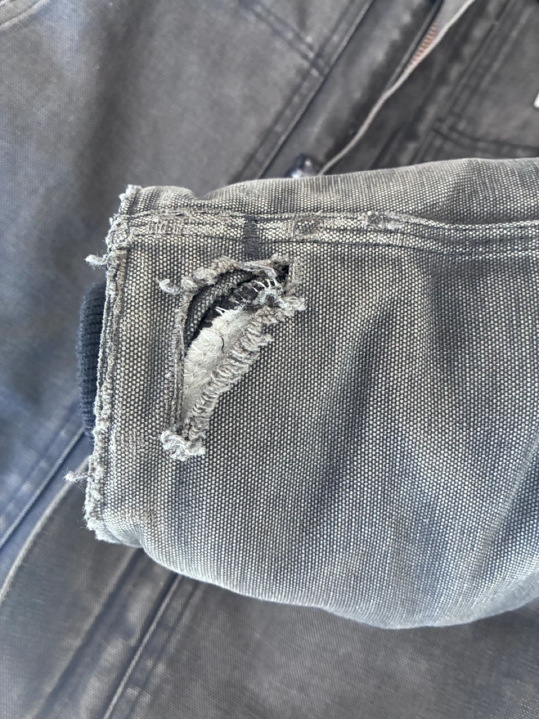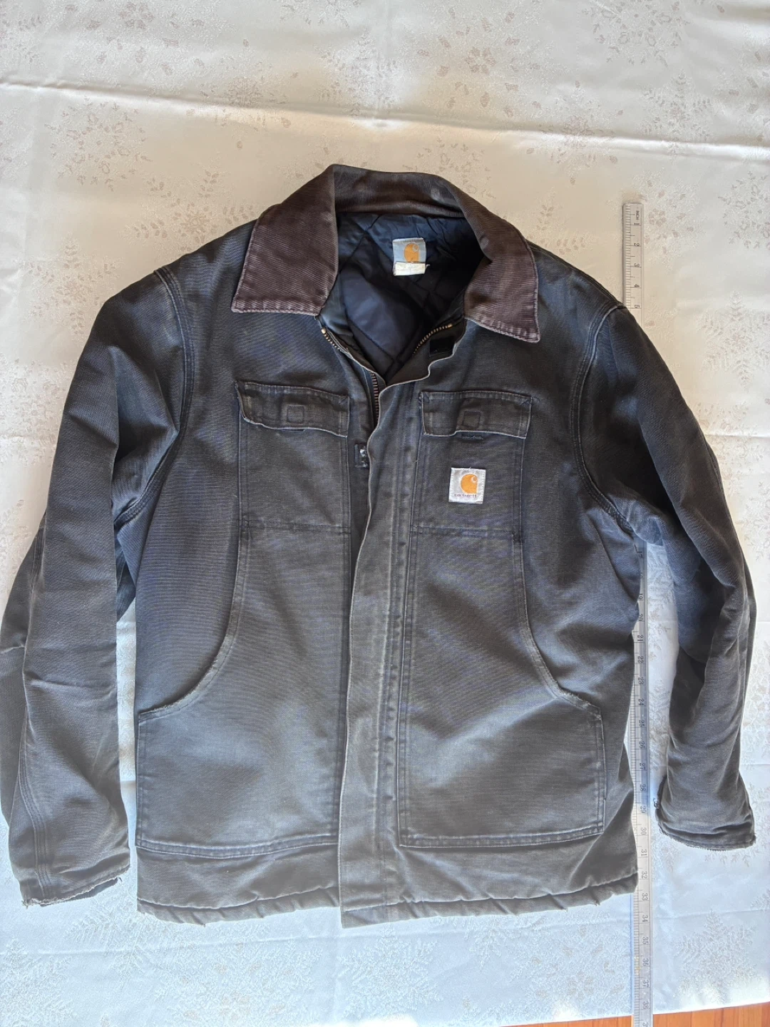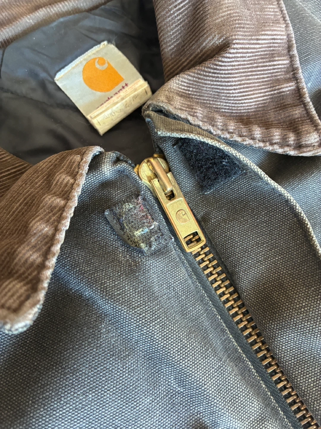 Carhartt work jacket in a dark grey colour. Features a corduroy collar and a full zip closure. Shows signs of wear with some minor rips on the cuffs and hem. Jacket itself is on good condition . CO3 blk 48 Reg