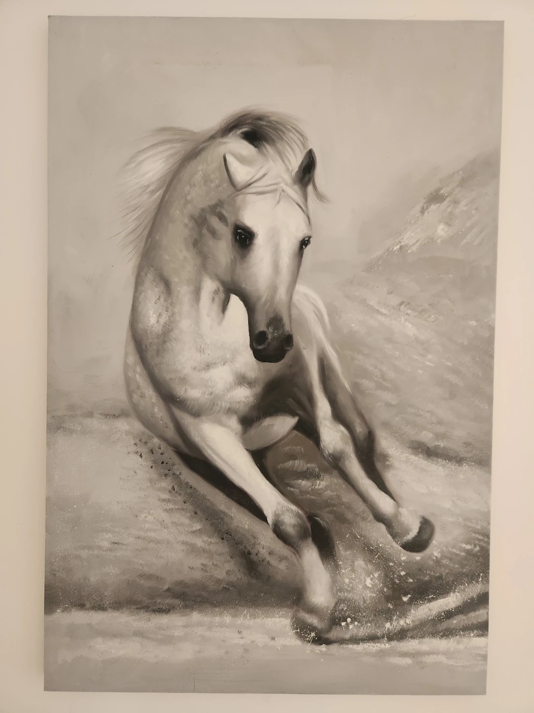 A striking monochromatic painting of a horse in motion. The artwork captures the dynamic energy of the animal. It's rendered in shades of grey and white, creating a powerful visual statement. 2 by 3 feet.