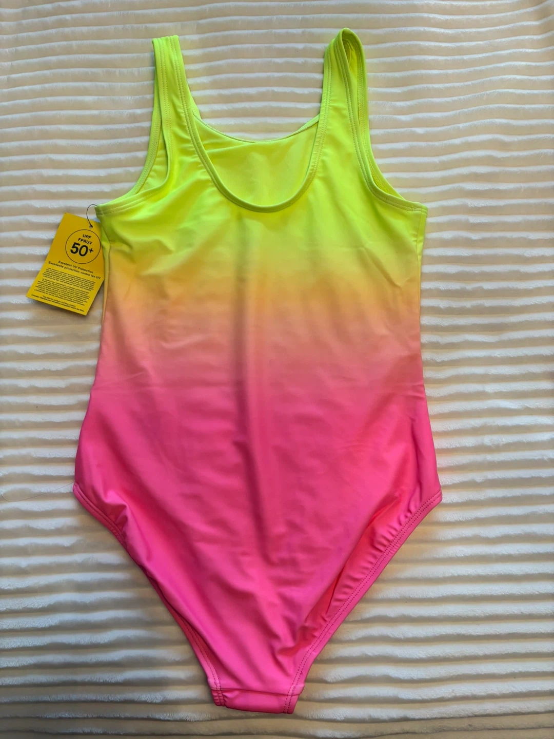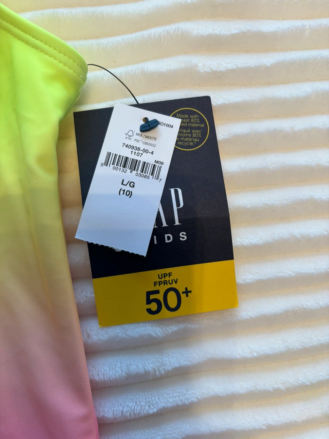 This NEW Gap Kids swimsuit features a bright ombre design from neon yellow to hot pink. It's made with 90% recycled material and offers UPF 50+ sun protection. Suitable for children wearing size L/G, which corresponds to a size 10.