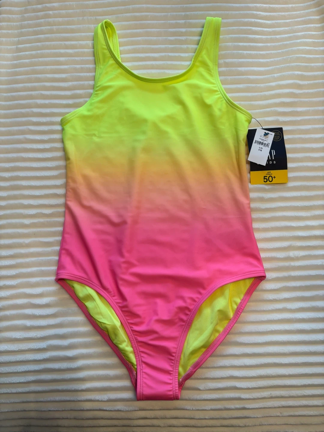 This NEW Gap Kids swimsuit features a bright ombre design from neon yellow to hot pink. It's made with 90% recycled material and offers UPF 50+ sun protection. Suitable for children wearing size L/G, which corresponds to a size 10.