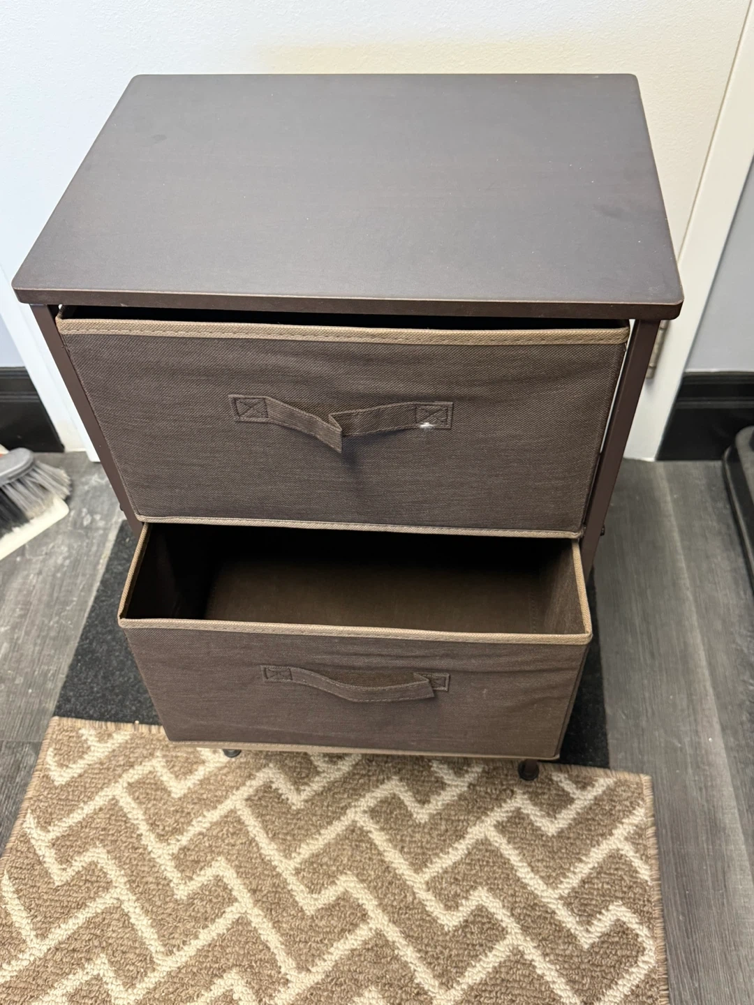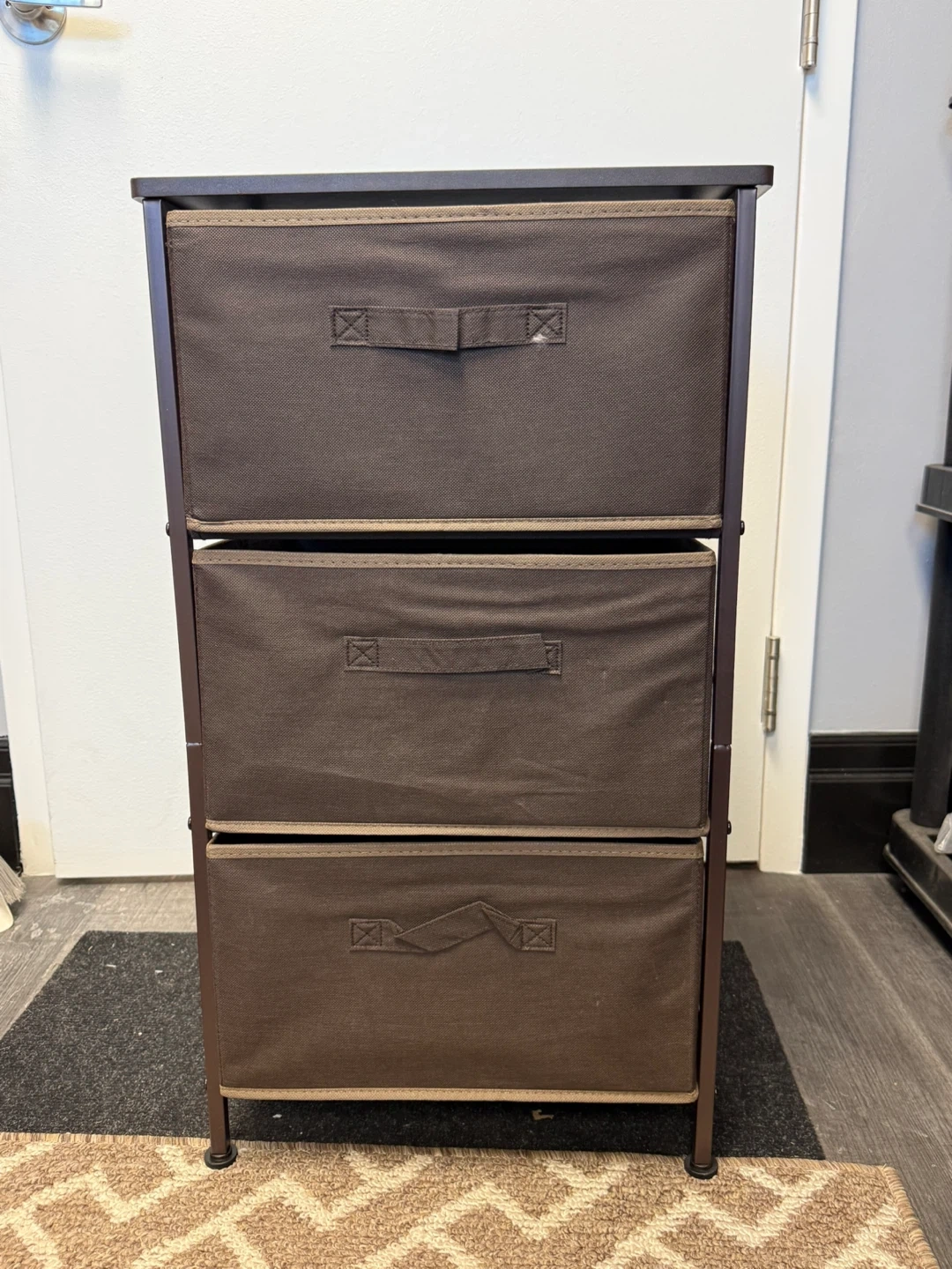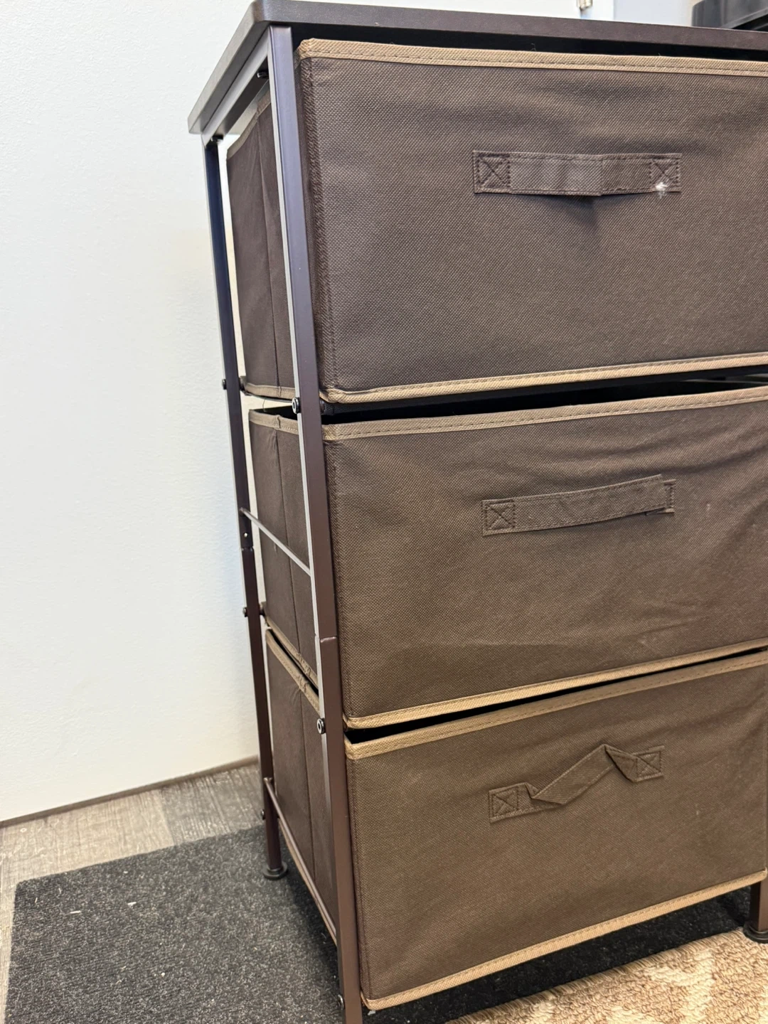 Brown fabric storage unit with three drawers. It's great for organizing smaller items. The frame is metal.