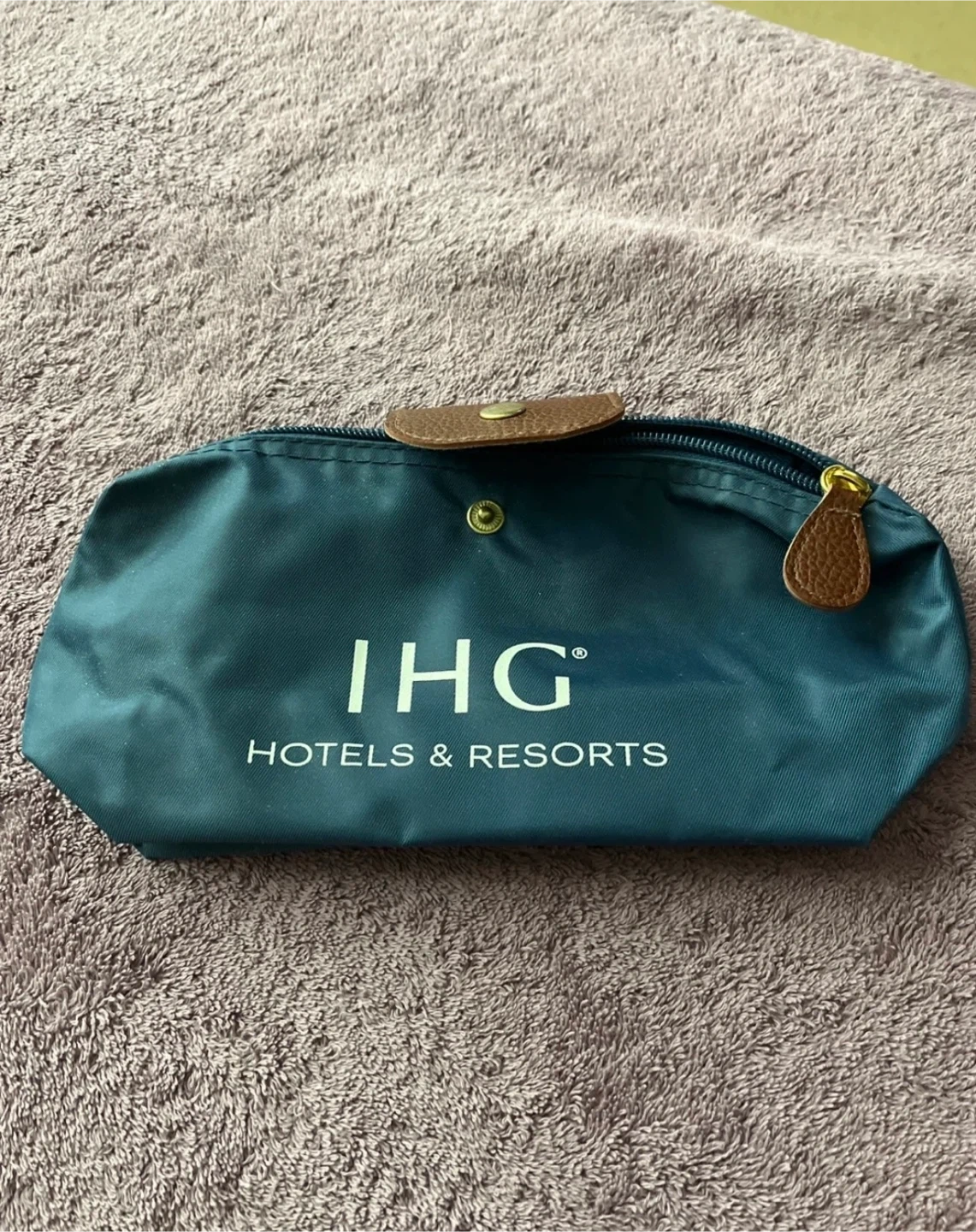 Teal IHG Hotels & Resorts toiletry bag. It's made of nylon with faux leather accents. Zipper closure for secure storage.