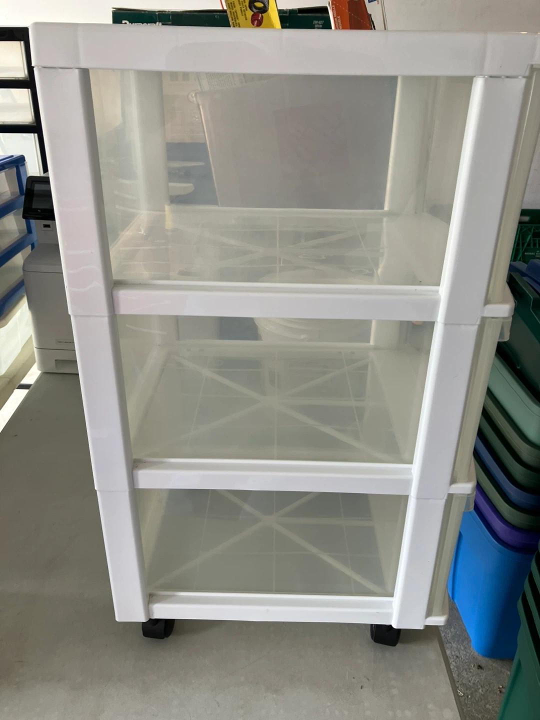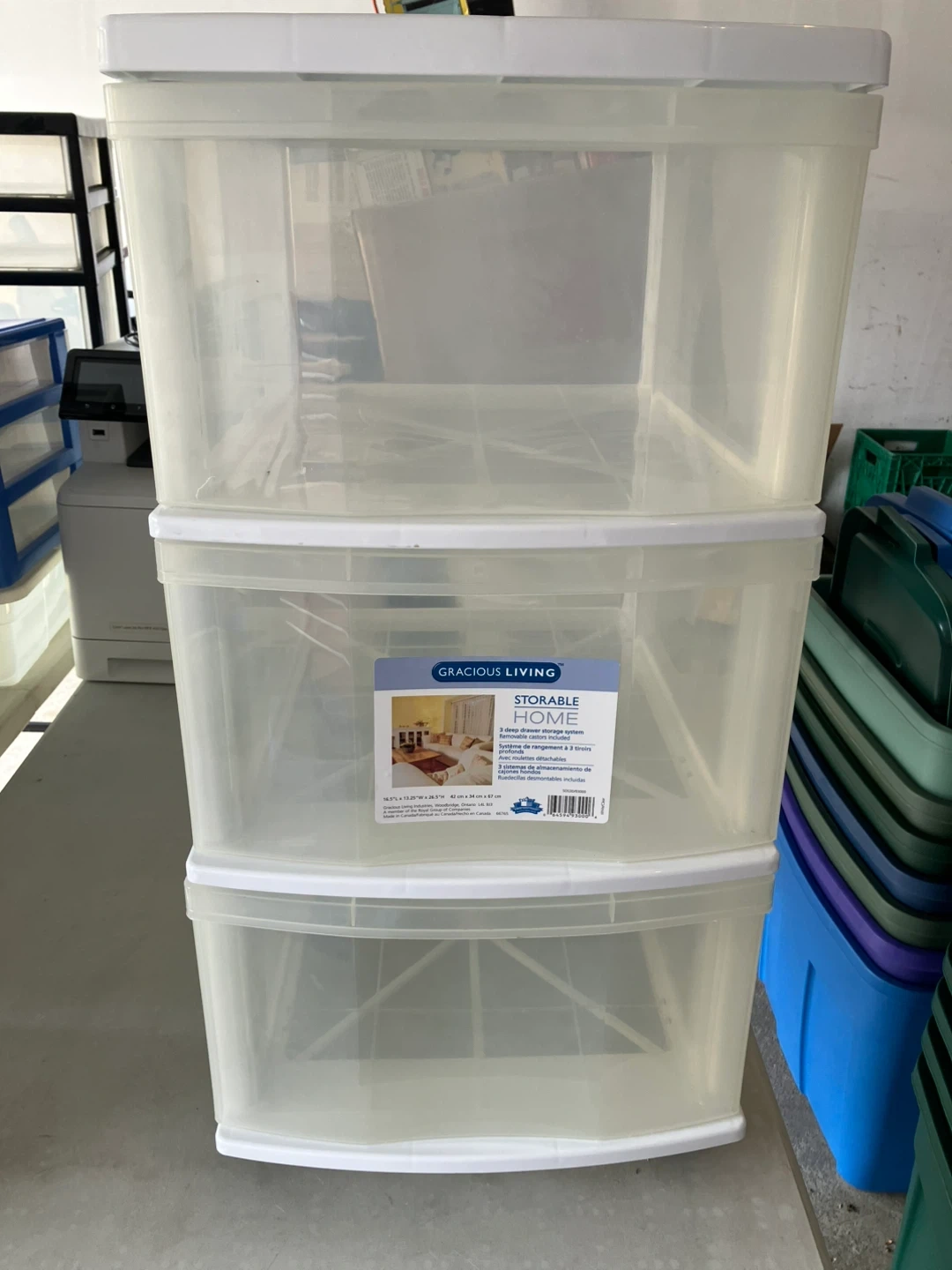 This is a Gracious Living 3-drawer storage unit. It's made of plastic and features clear drawers. Wheels are attached for easy moving. Perfect for organizing small items!