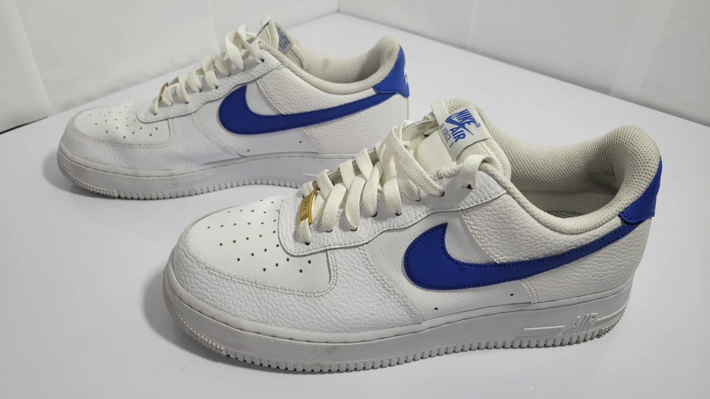 White leather Nike Air Force 1 Low sneakers with royal blue accents. These classic kicks feature a durable leather upper and a comfortable rubber sole. They're a timeless streetwear staple for everyday wear. Pick up location: 5900 Decatur Street Ridgewood, NY 11385