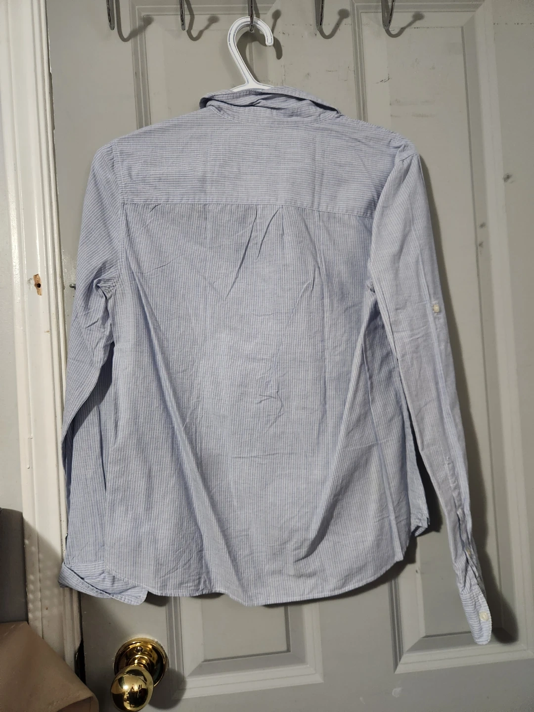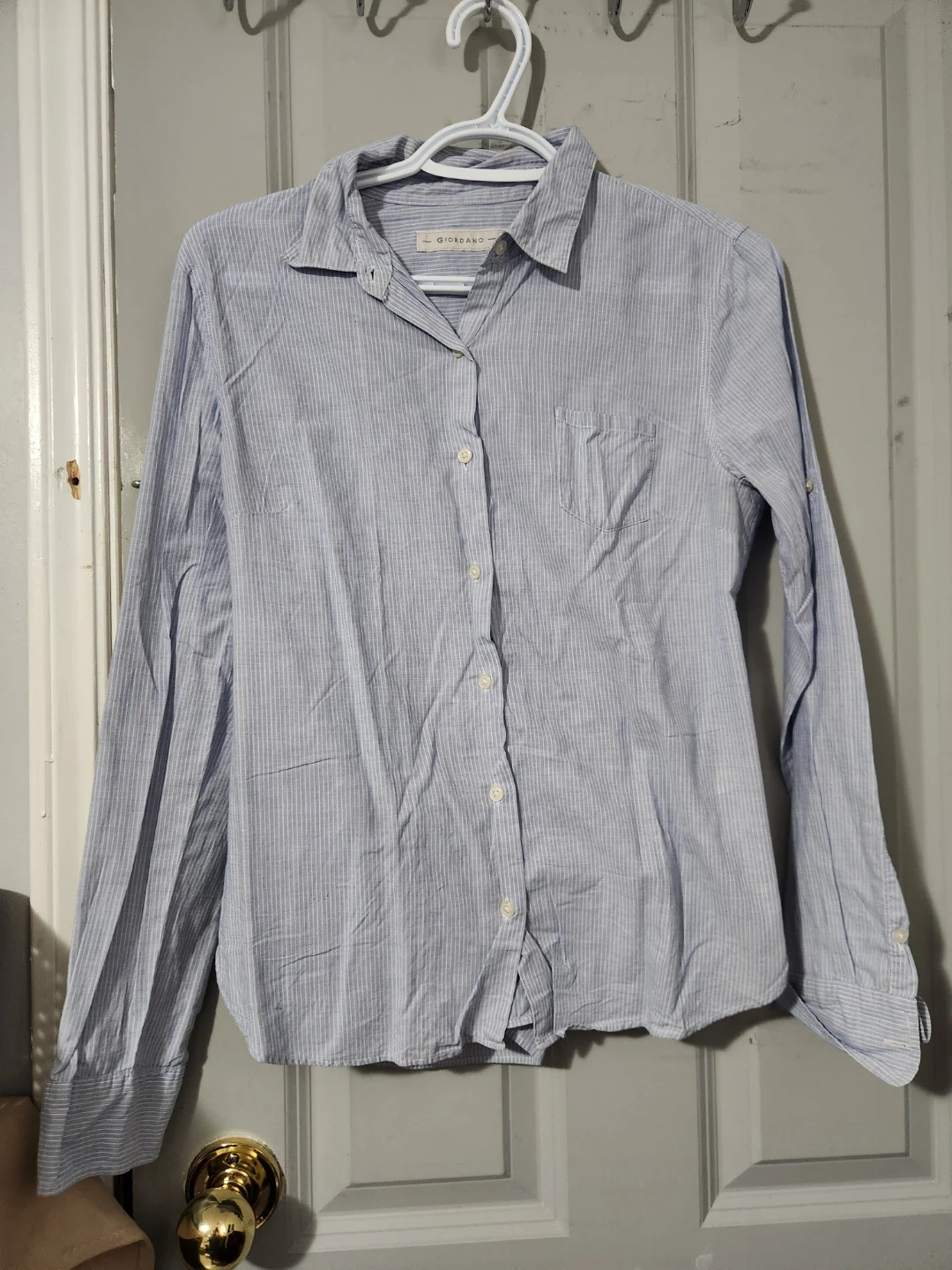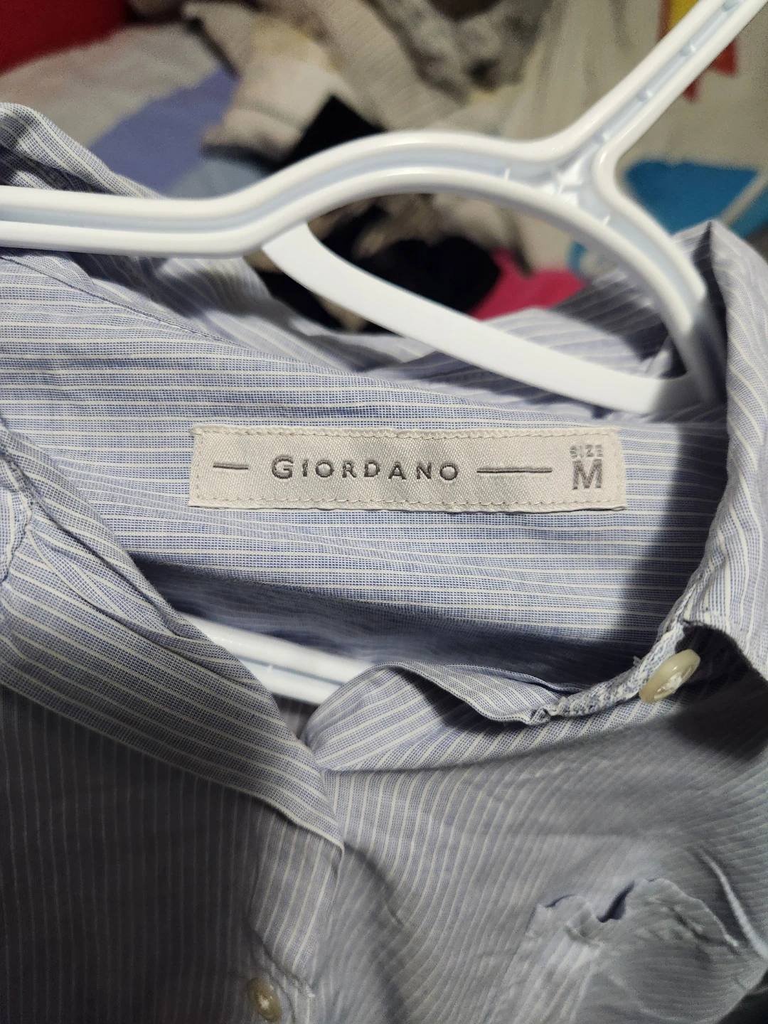 I'm selling a Giordano striped shirt in size medium. It's in great condition and perfect for casual wear! The light blue and white stripes give it a classic look. Feel free to message me with any questions!