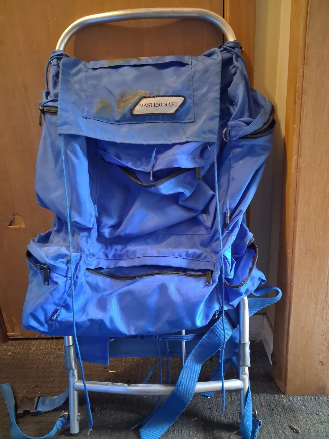 Blue Mastercraft backpack frame with multiple zippered compartments. Metal frame construction. Great for hiking or camping trips!
