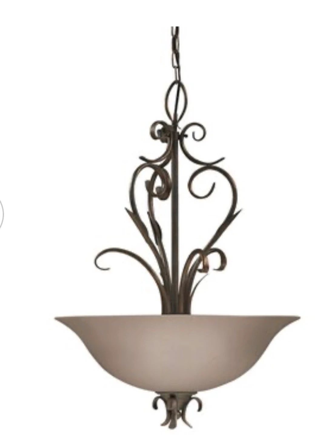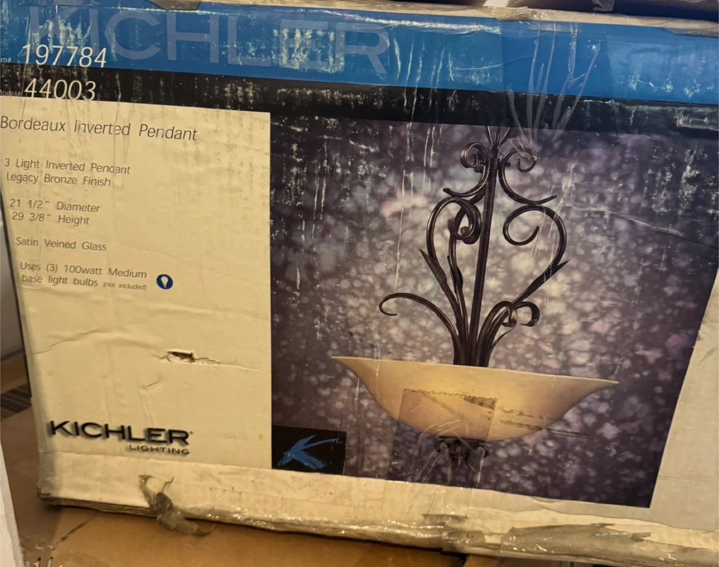 This Kichler Bordeaux Inverted Pendant light fixture features a Legacy Bronze finish. It has a 21 1/2" diameter and stands 29 3/8" tall. The shade is made of Satin Veined Glass. It uses three 100-watt medium base light bulbs, which are not included.