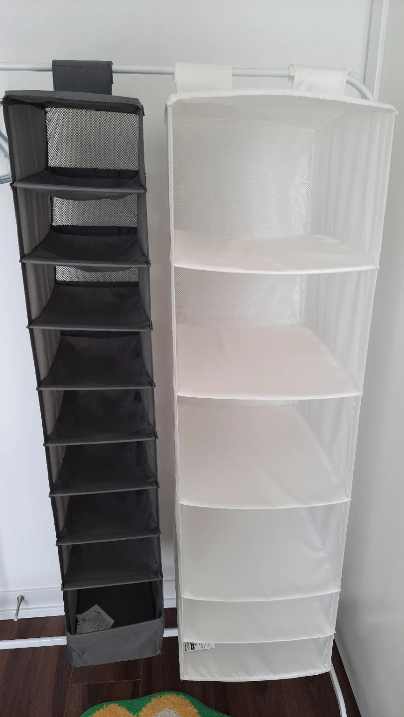 One is grey with 9 compartments (22cm×34cm×120cm) and the other is white with 6 shelves (35cm×45cm×125cm).