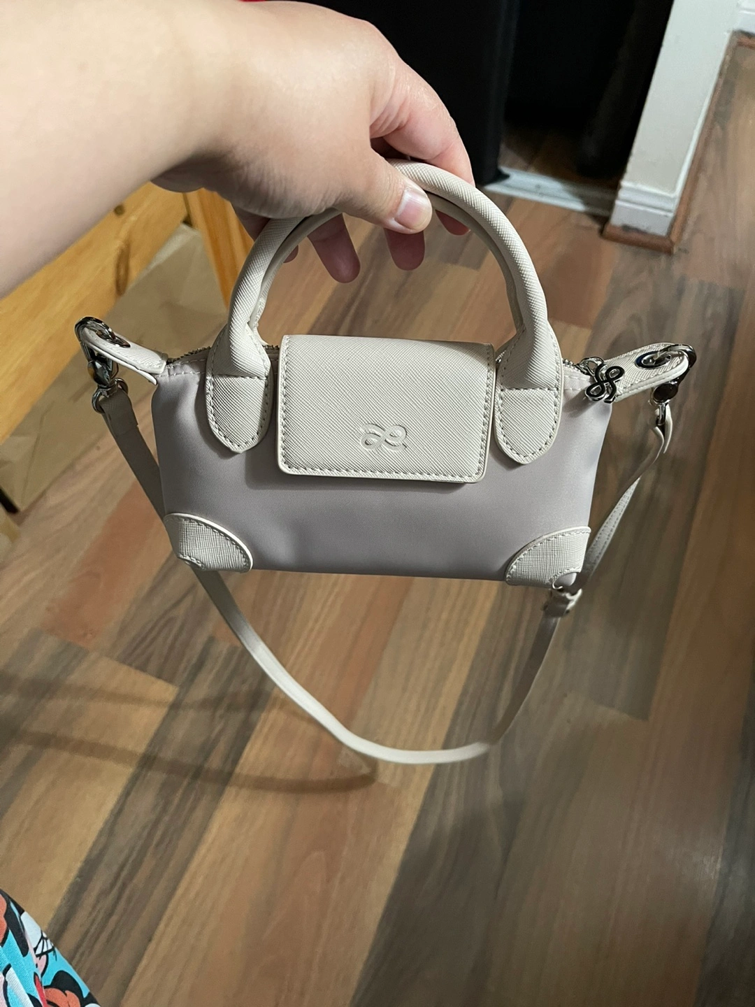 A small grey handbag with white accents. Features a handle and a crossbody strap. The front flap has a small logo. This is the perfect handbag for a relaxing stroll.