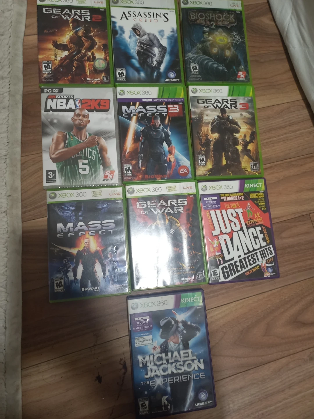 Bundle of various Xbox 360 games including Gears of War series, Mass Effect, Assassin's Creed, Bioshock, NBA 2K9, Just Dance, and Michael Jackson The Experience. All games appear to be in cases. $10 per game or willing to negotiate best price. Some games have plastic covering.