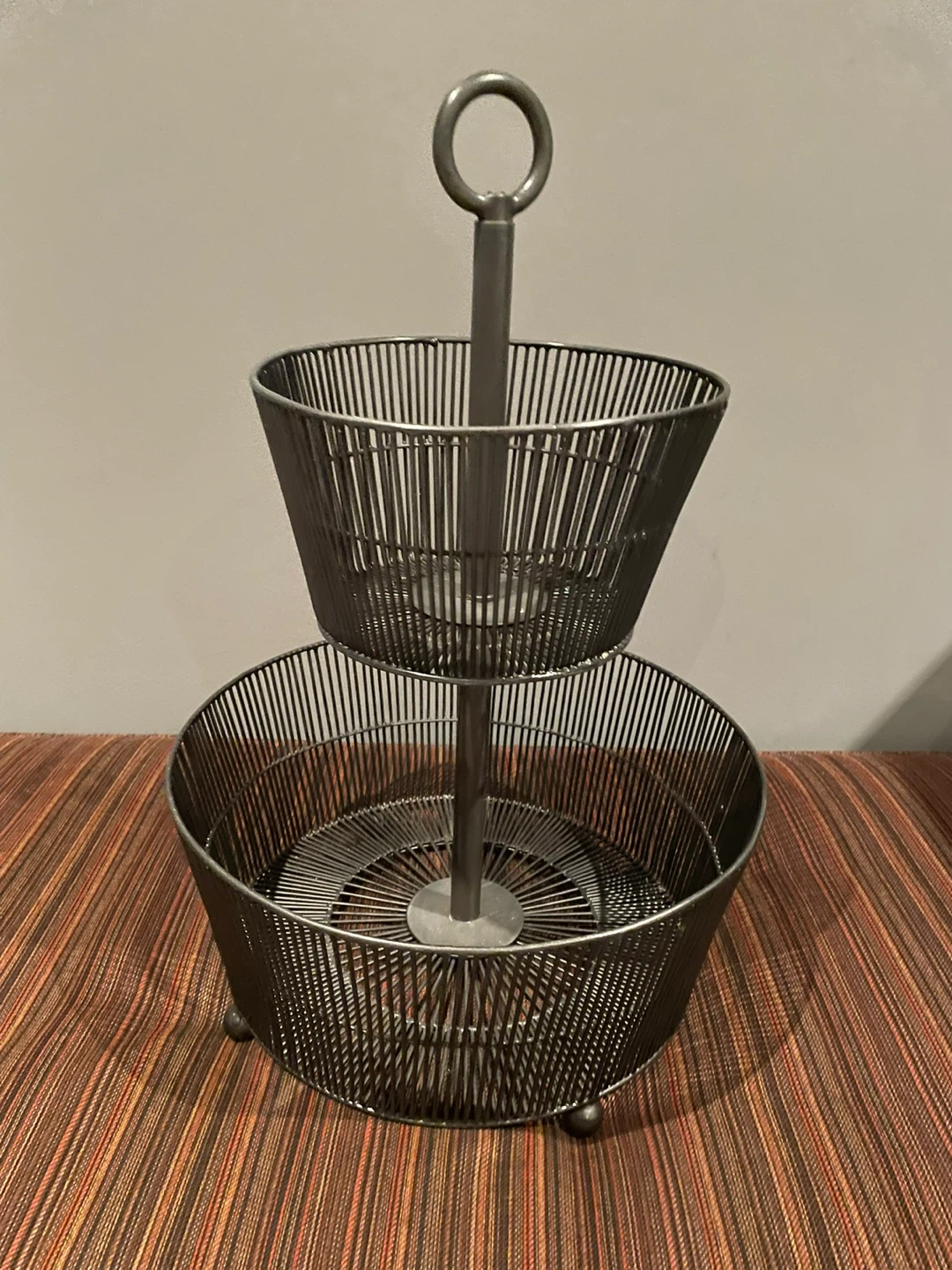 Selling a handy two-tiered metal fruit basket! It's perfect for keeping your fruits and veggies organized and looking stylish on your countertop. Great for adding a touch of modern design to your kitchen