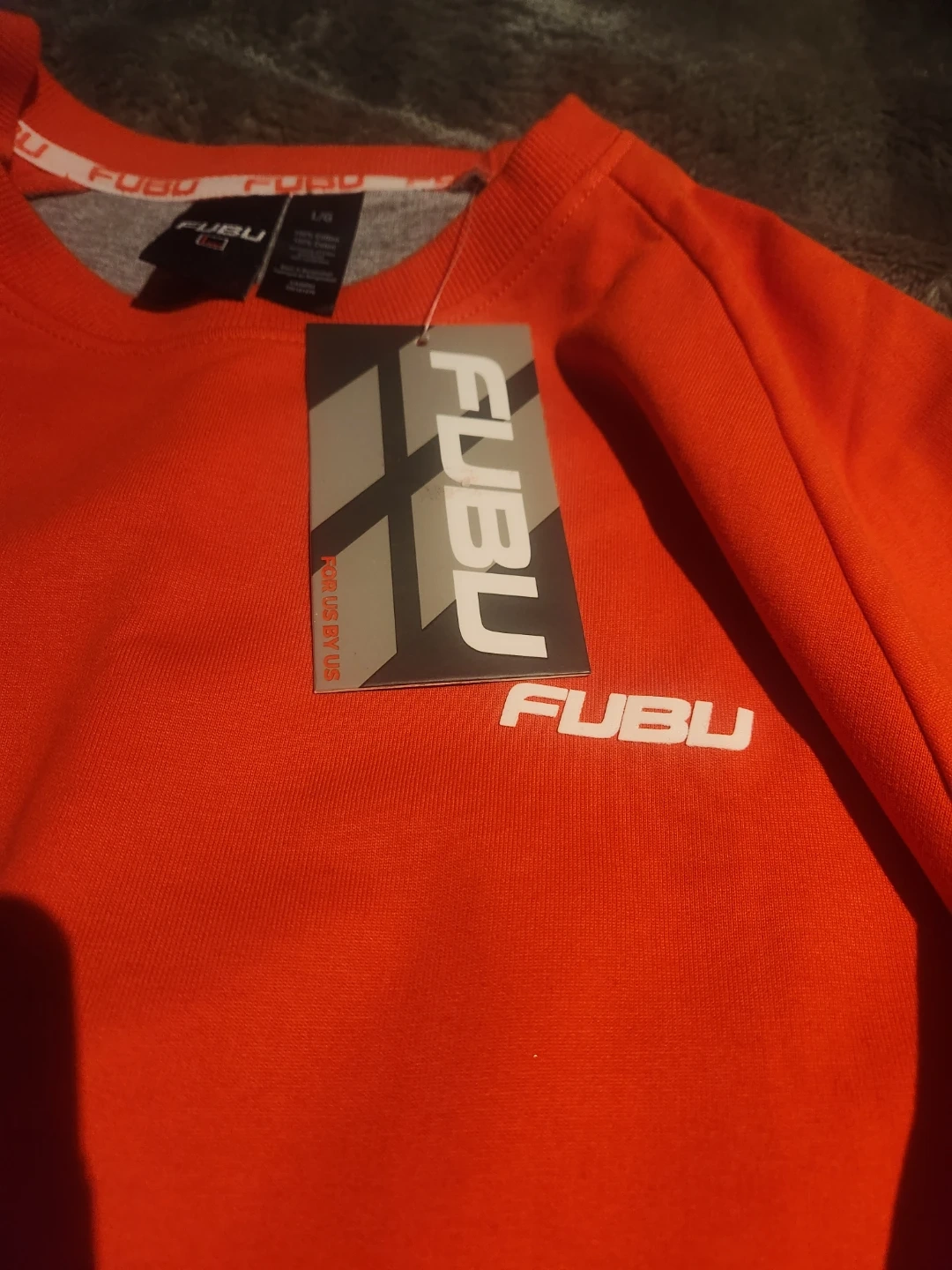 This FUBU crewneck sweatshirt is a vibrant orange. It features subtle striped detailing on the cuffs and hem. Made for comfort, it's perfect for casual wear. Size large.