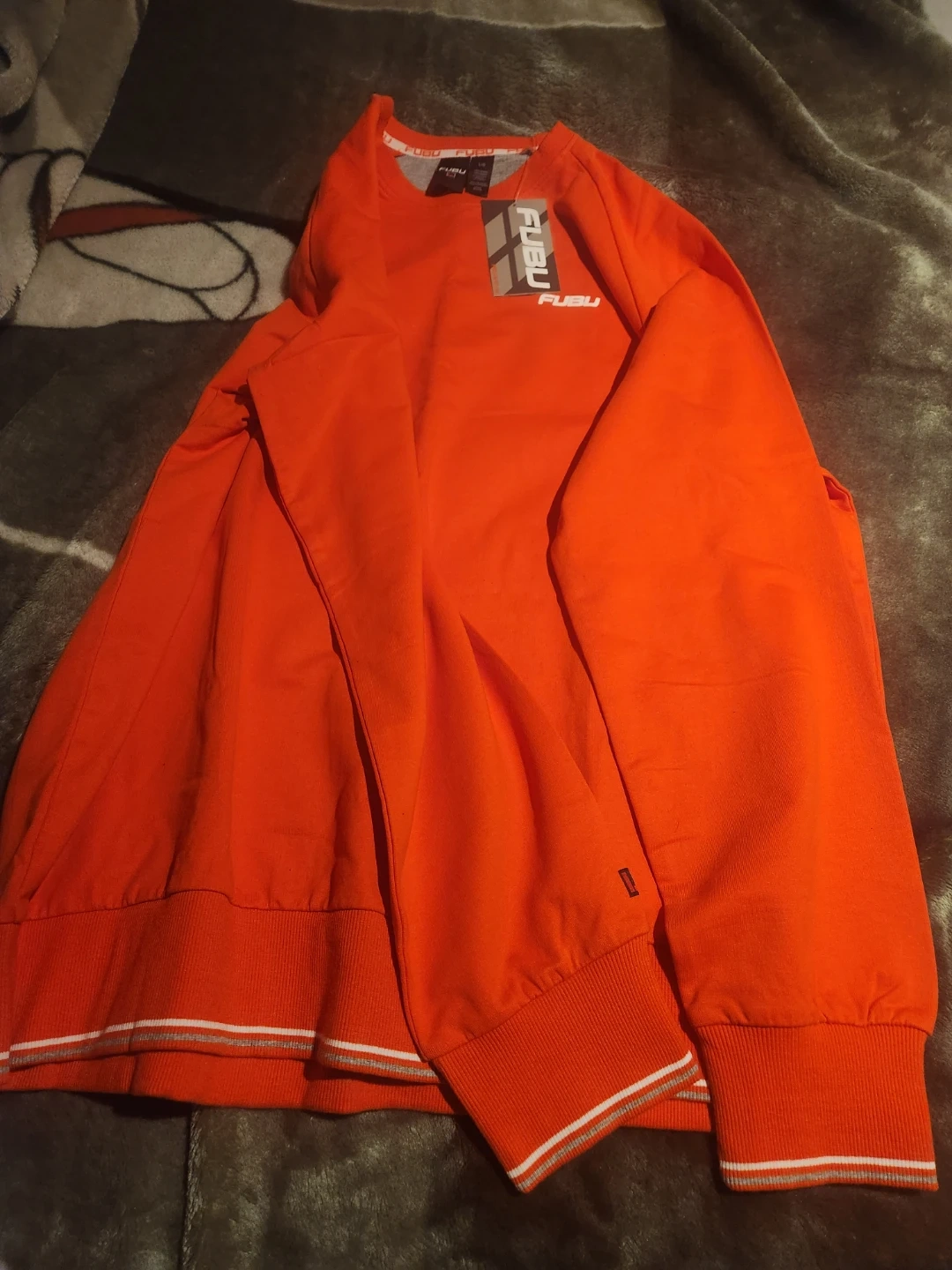 This FUBU crewneck sweatshirt is a vibrant orange. It features subtle striped detailing on the cuffs and hem. Made for comfort, it's perfect for casual wear. Size large.