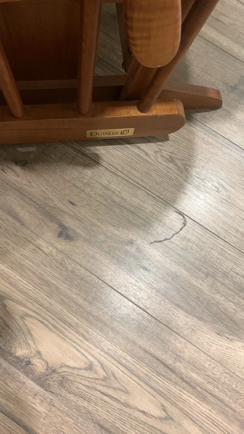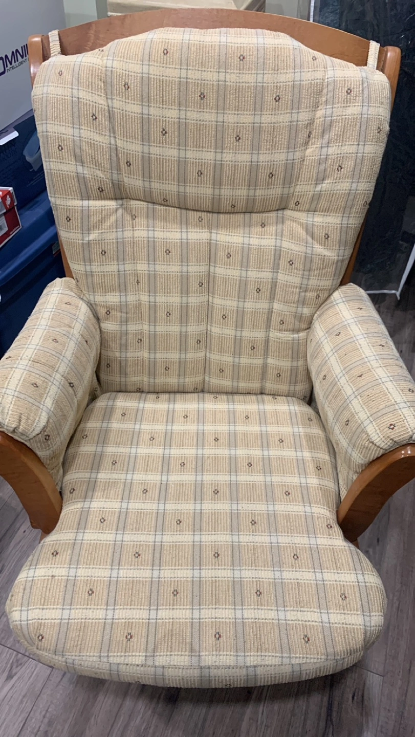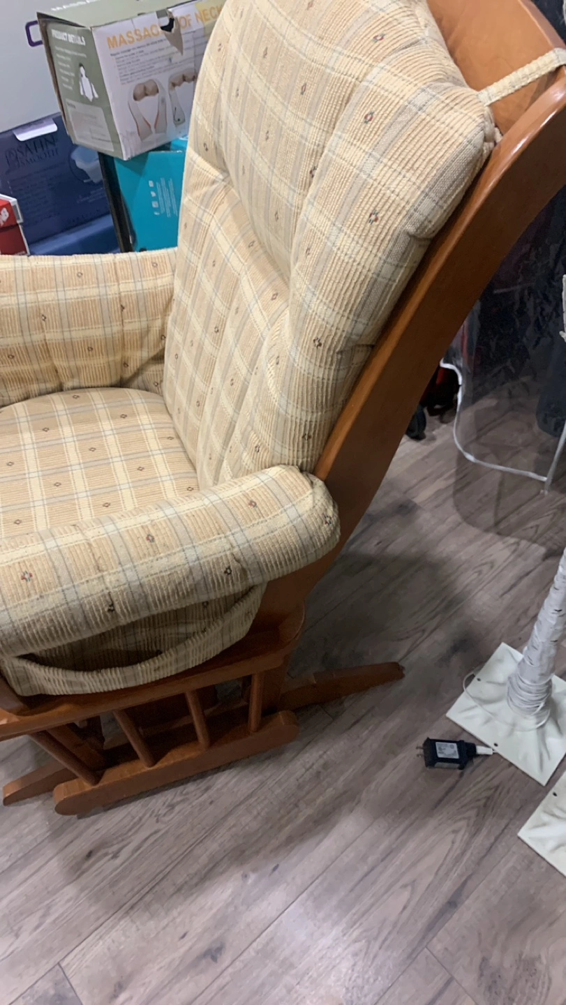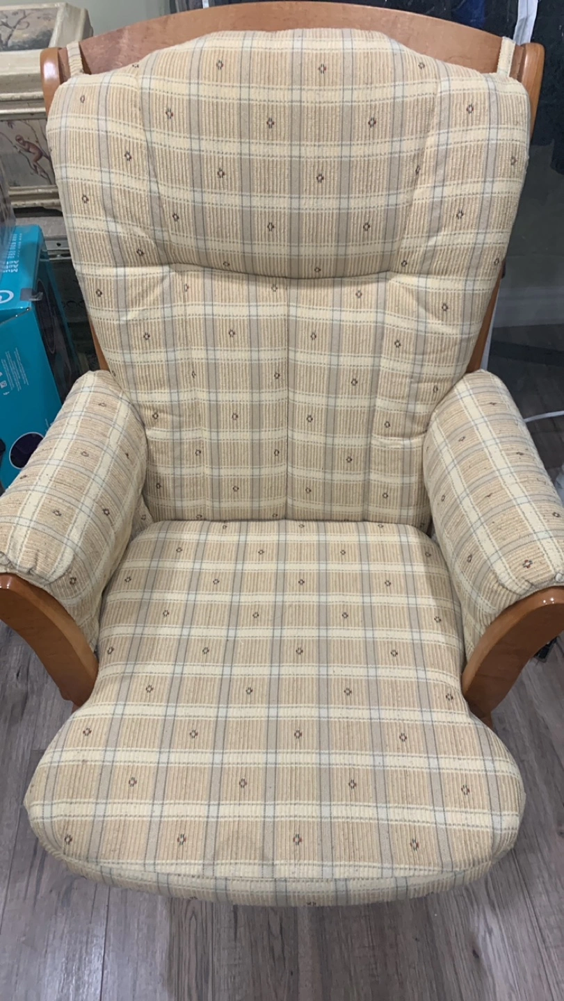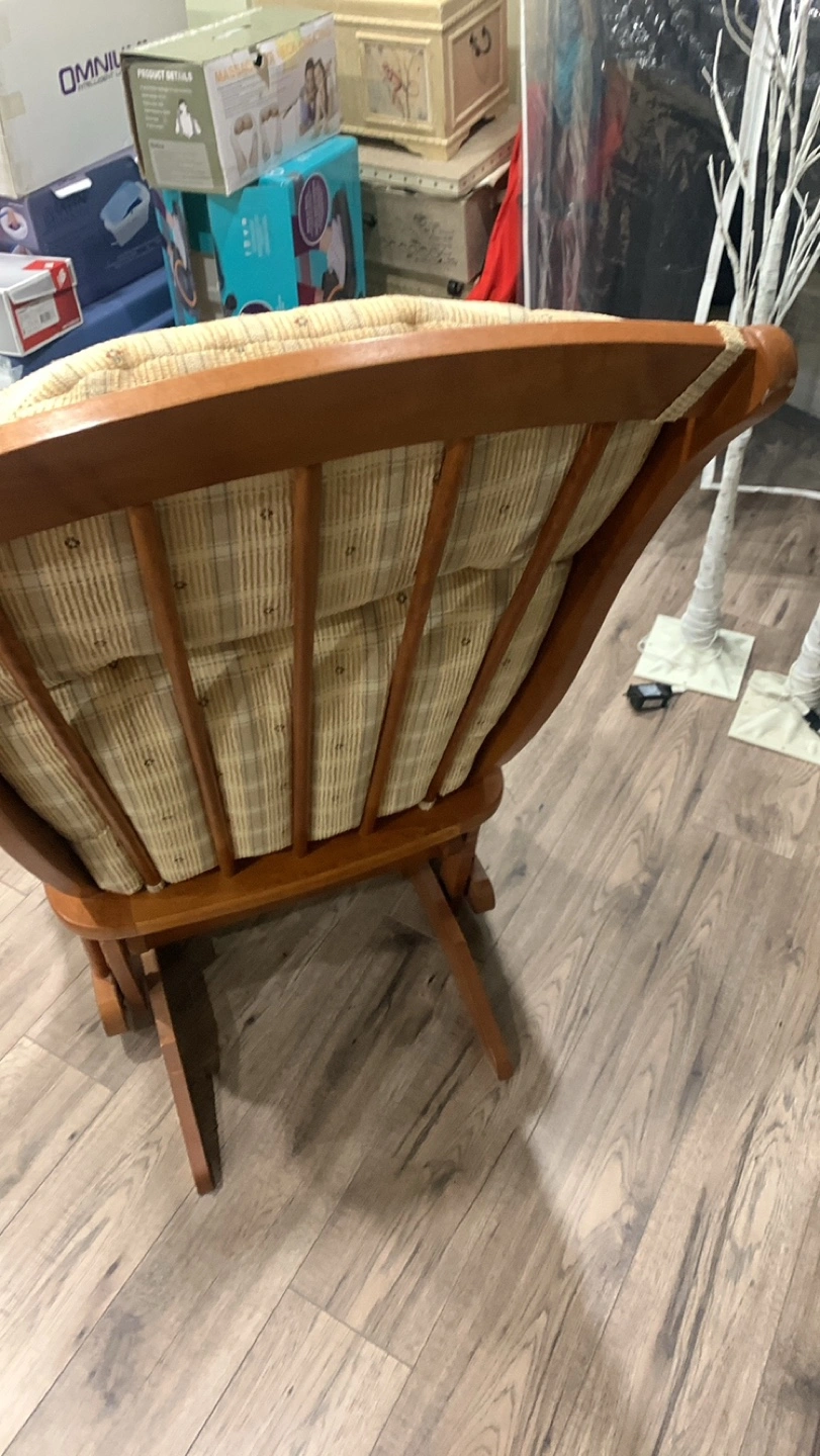 Gently used DuTailier rocking chair. Wooden frame, beige plaid fabric. Comfortable and sturdy. Perfect for nursery or living room.