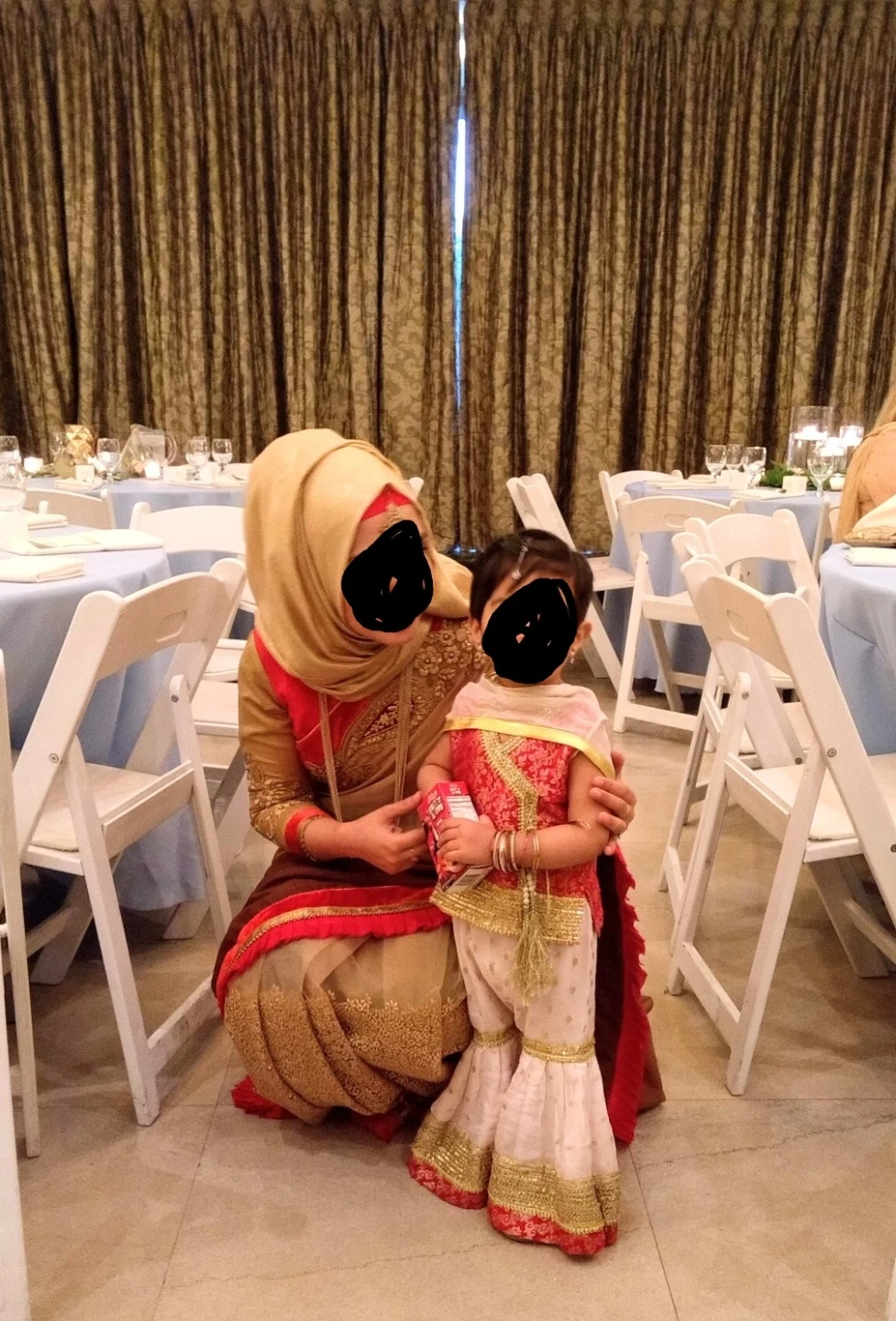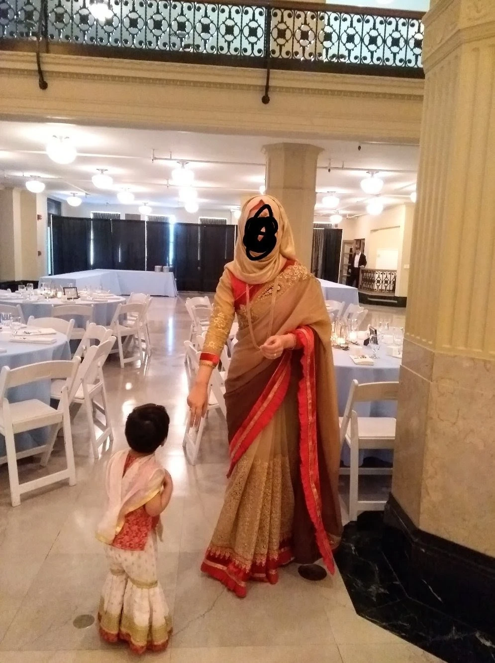Gold and beige sari with red trim and intricate gold embroidery. This traditional garment is adorned with sparkling details. It's perfect for special occasions and cultural events. Sari includes a matching blouse piece.