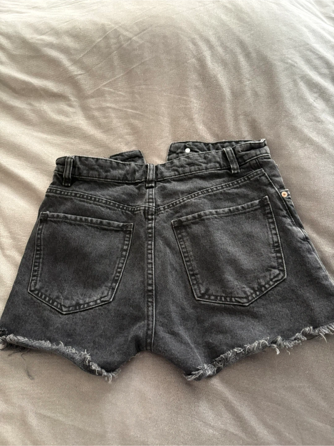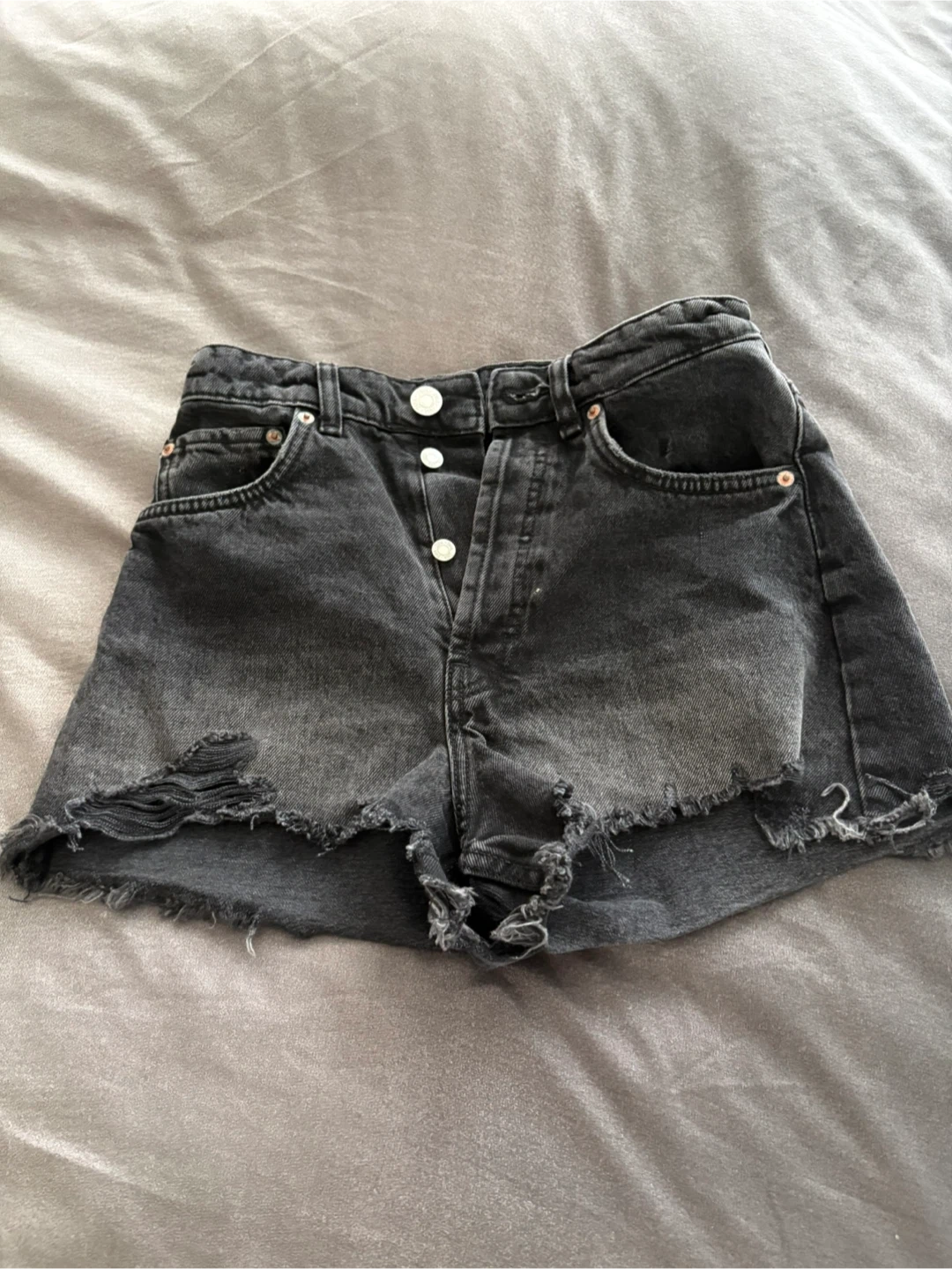These are stylish black denim shorts with a distressed hem. They're a high-waisted fit. The denim material offers a comfortable feel. Perfect for casual wear during warmer weather!