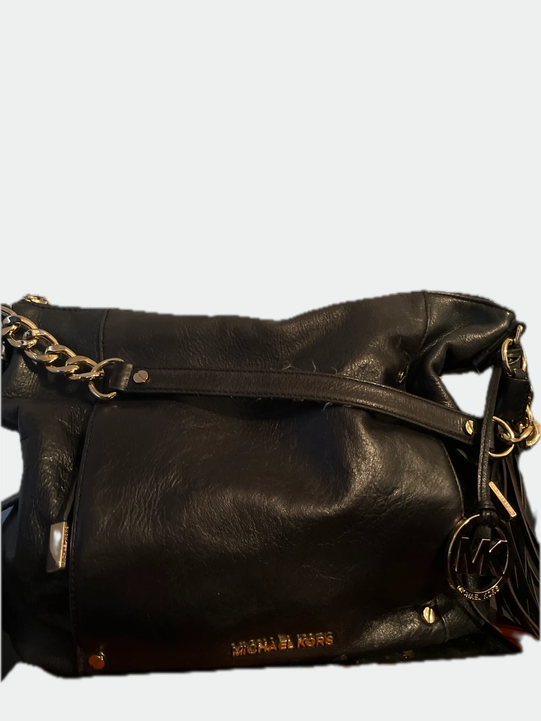Selling a Michael Kors shoulder bag in black leather. It has a gold chain detail and the classic MK logo charm. It's in great condition!