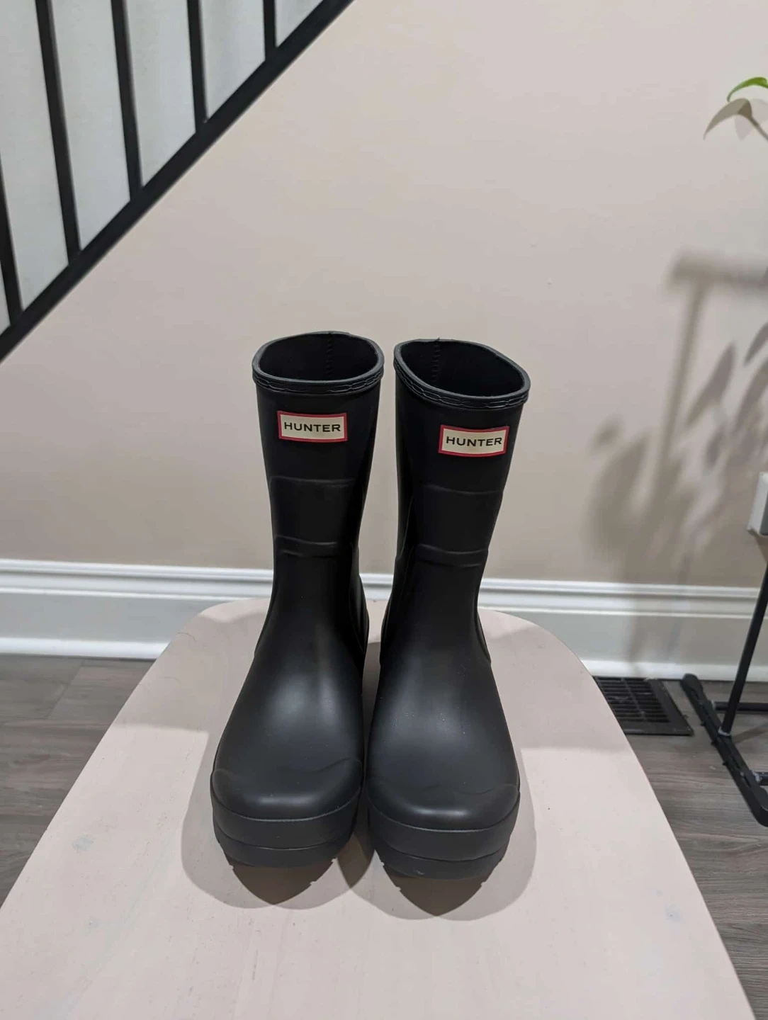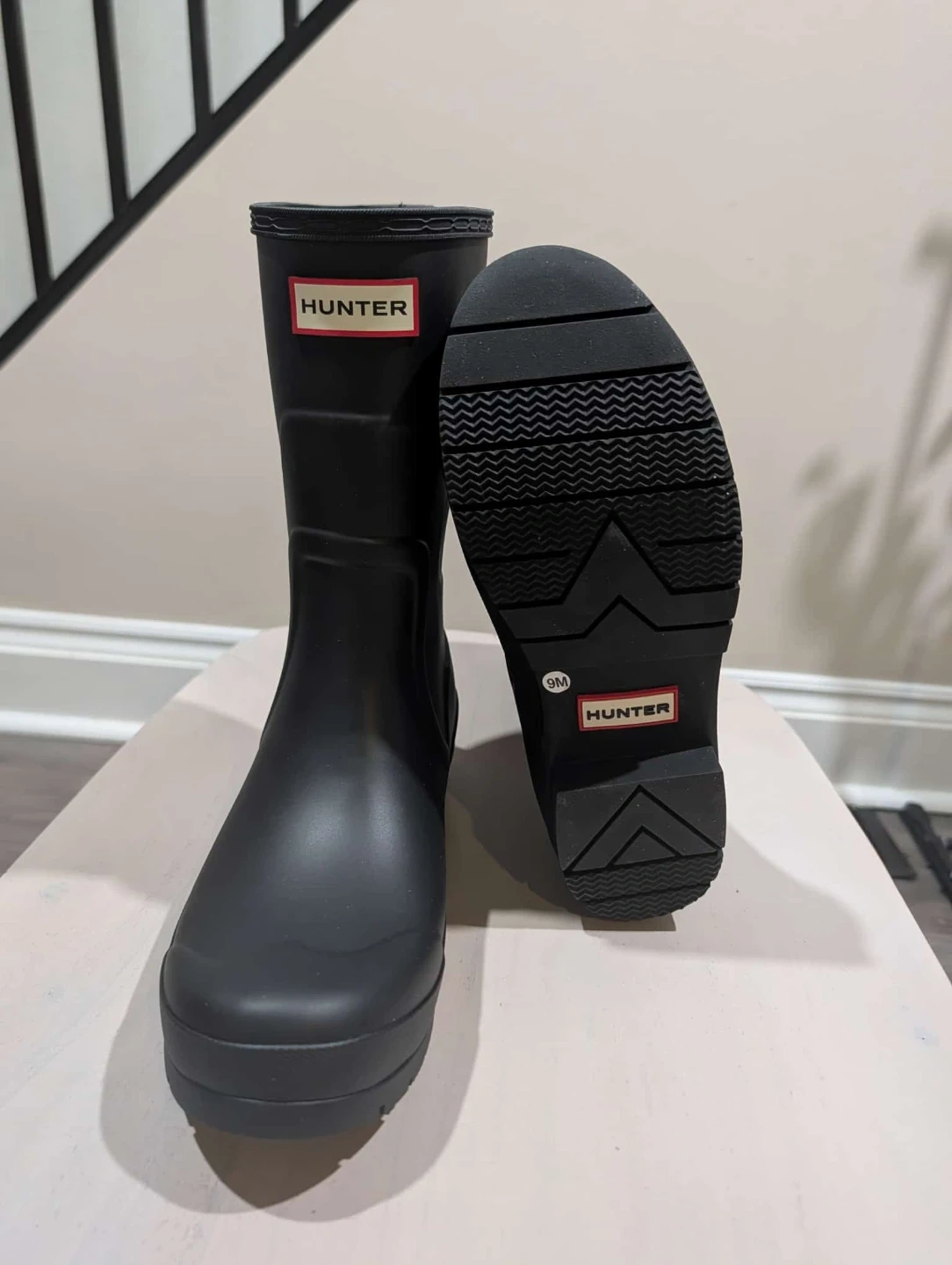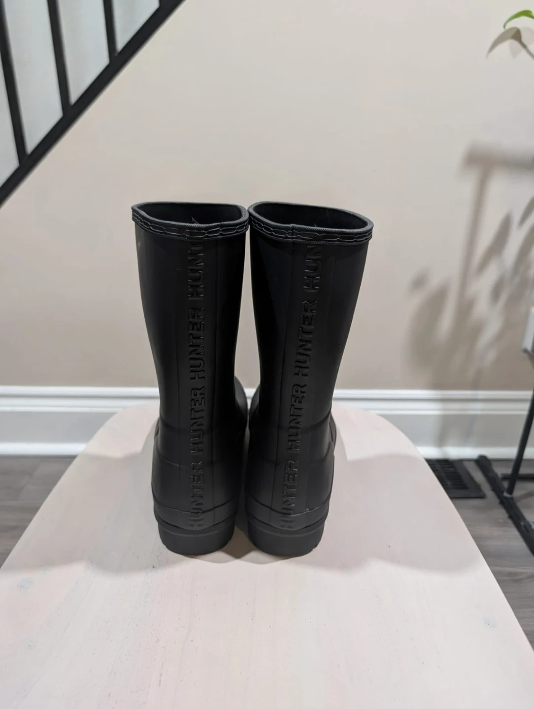 Black Hunter rain boots. These are a size 9M. They're made of rubber and are perfect for wet weather!