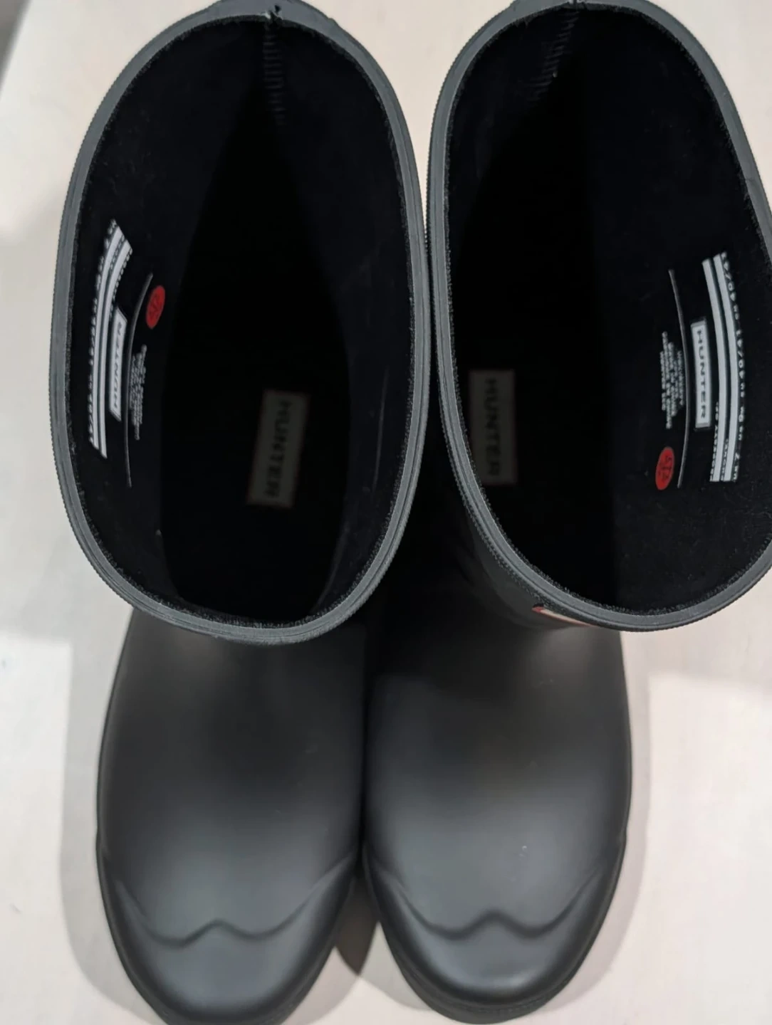 Black Hunter rain boots. These are a size 9M. They're made of rubber and are perfect for wet weather!
