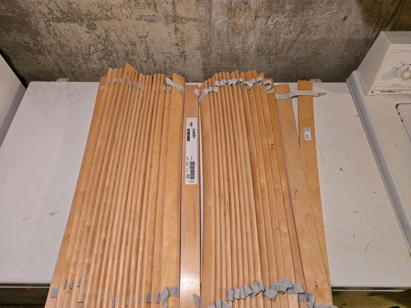 "IKEA Luroy bed slats. These wooden slats are designed to provide support for a mattress. They're made of birch veneer and are bound together with grey webbing."