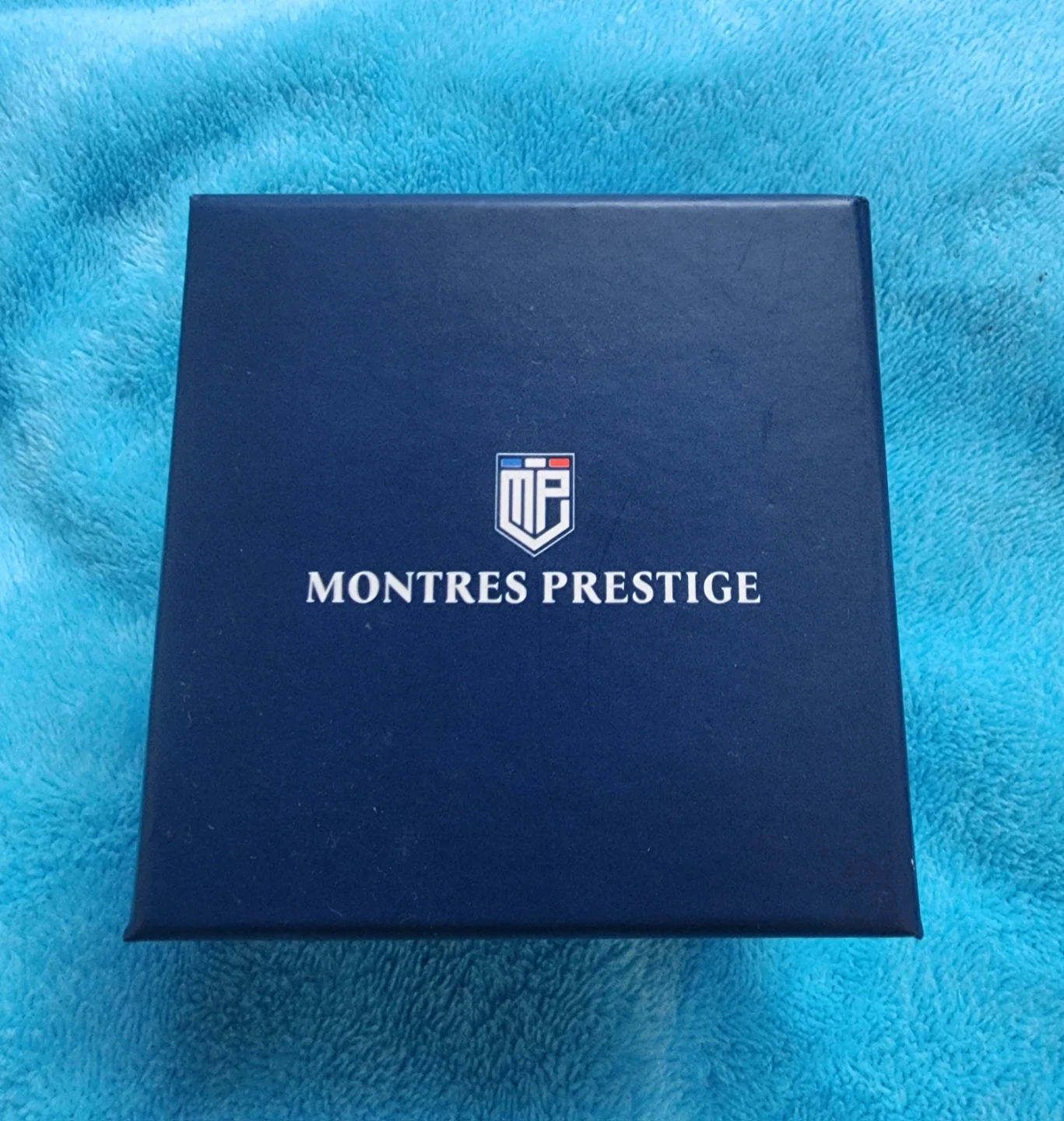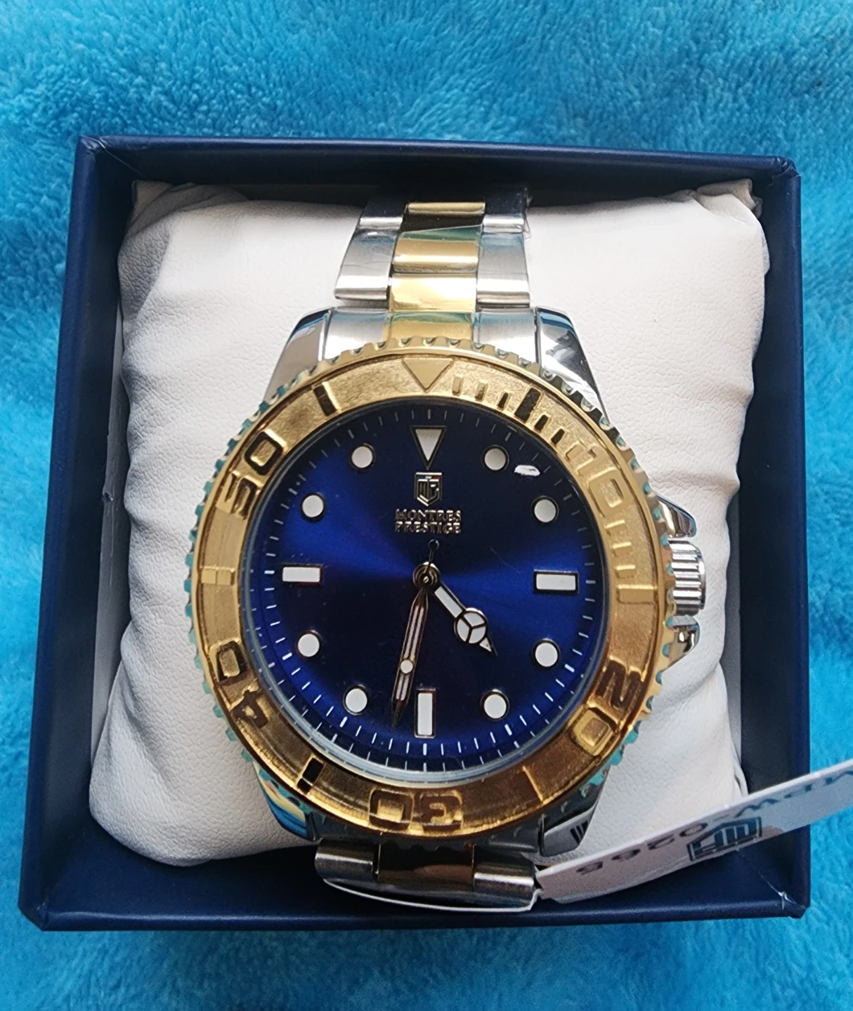This is a New In Box Montres Prestige watch with a blue dial and gold-tone accents. It comes in its original box. The watch band is a mix of silver and gold-tone stainless steel.
