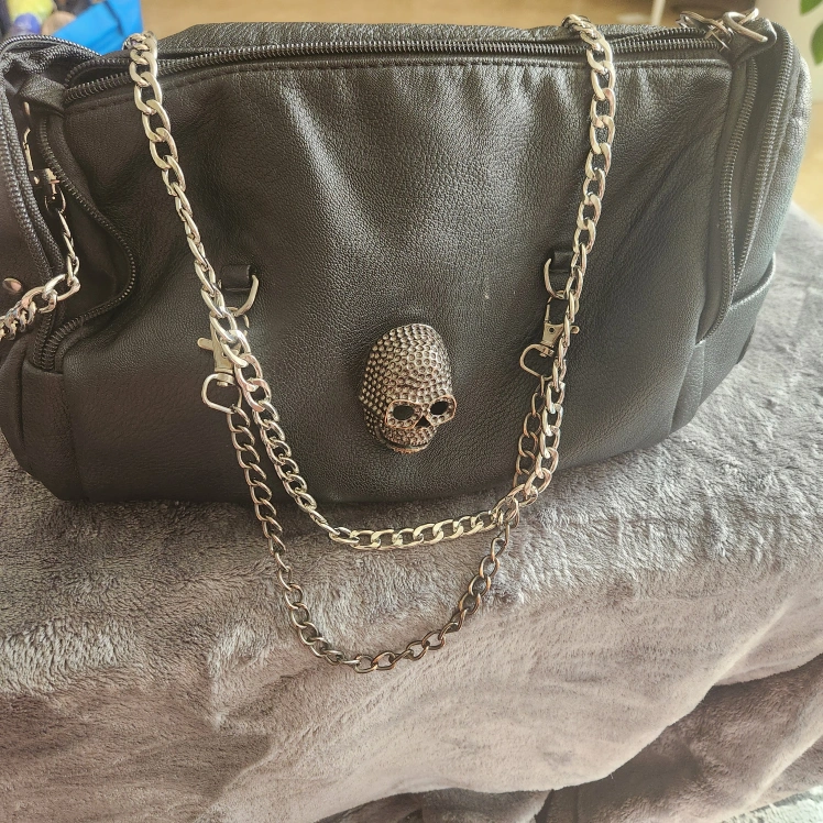 Adorned.with tiny skulls on.side, both sides have zipper pockets and small pockets over them to slide phone or whatever into. Inside has one large zipper pocket and six other discreet pockets. Front has.a.1x2"x1" steel skull with a chain that hangs from one corner to the other. All zippers have skull and tassels strap is adjustable, faux leather but soft and.hangs like a hobo bag.