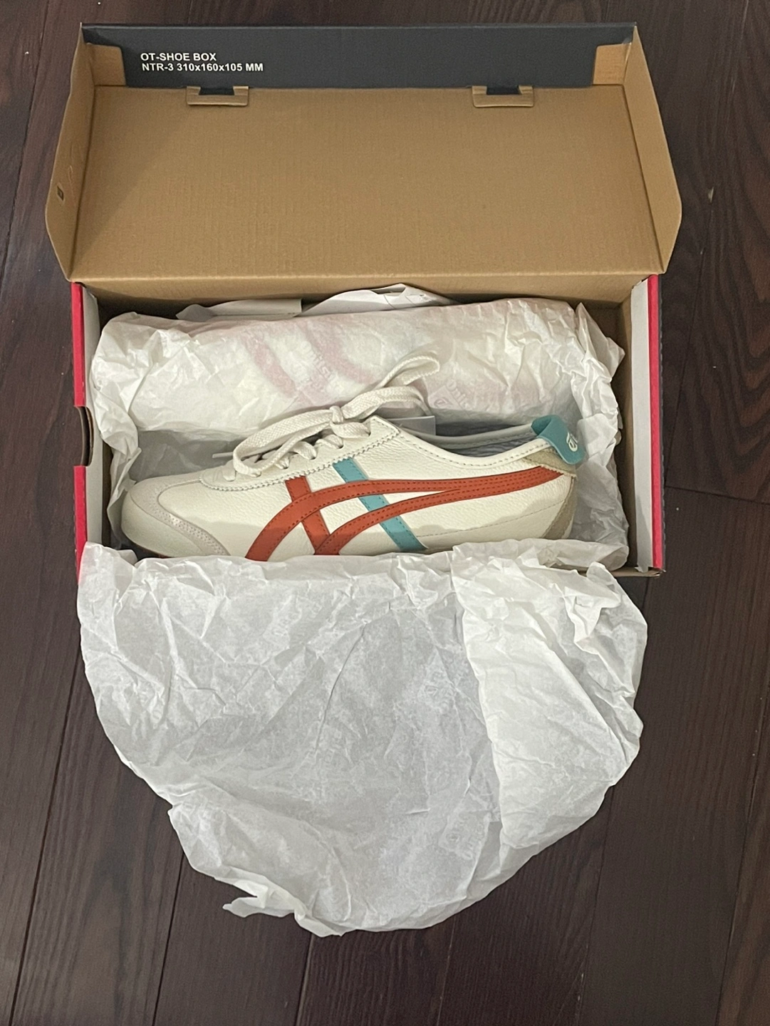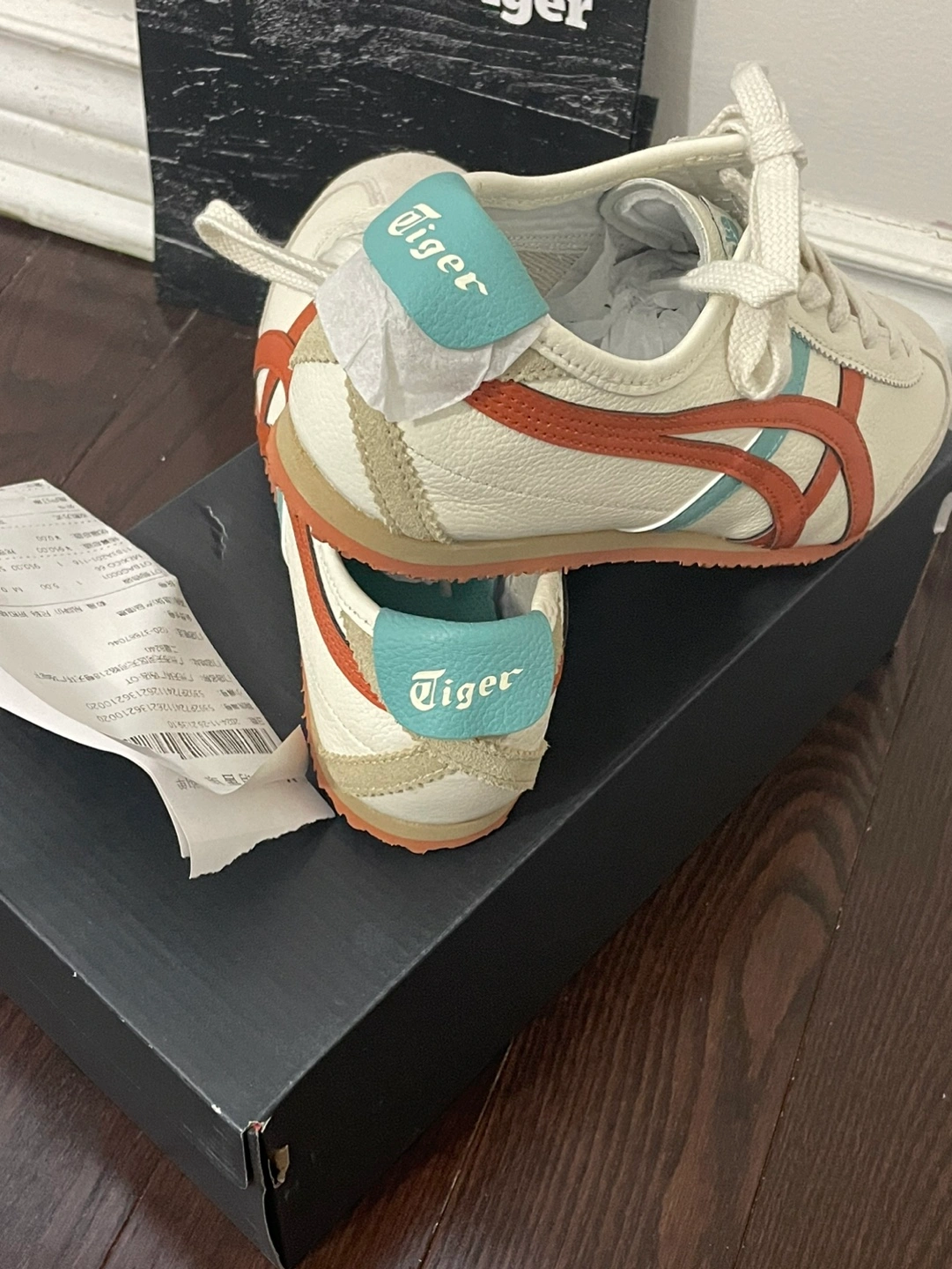 Cream leather sneakers with orange and teal accents. New in box with original packaging. Classic design, stylish and comfortable. Perfect for everyday wear.
