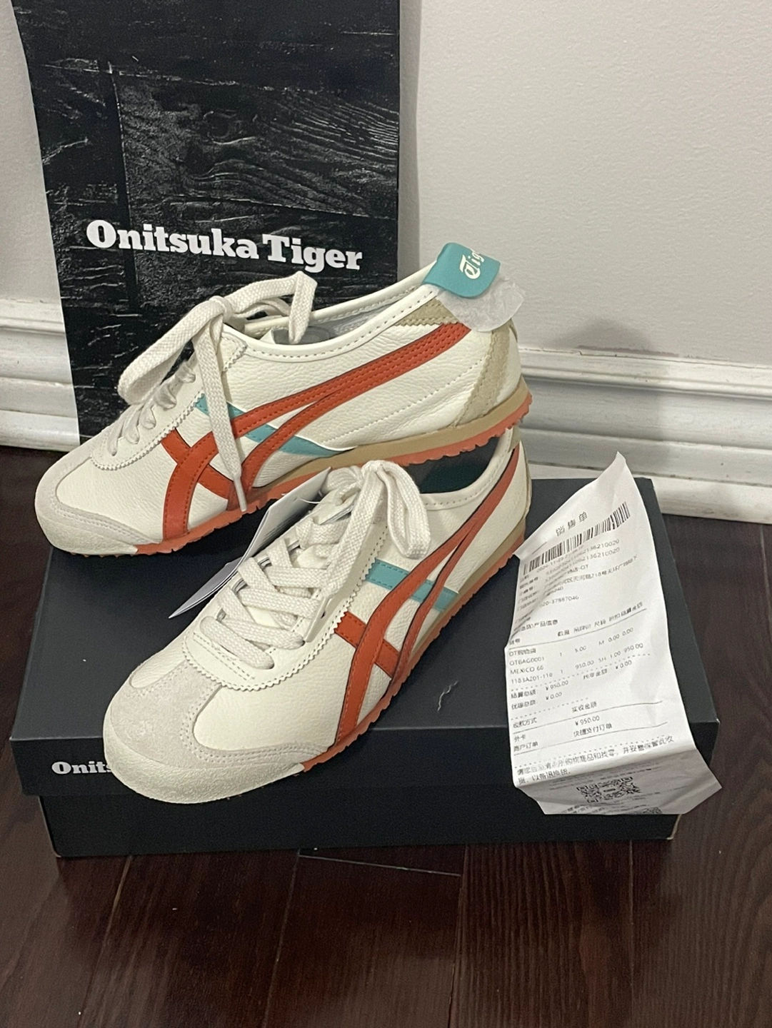 Cream leather sneakers with orange and teal accents. New in box with original packaging. Classic design, stylish and comfortable. Perfect for everyday wear.
