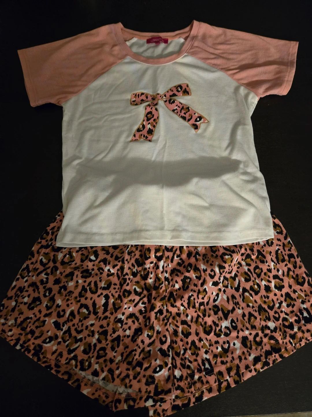 This adorable pajama set features a white ribbed t-shirt with pink raglan sleeves and a leopard print bow detail. The matching shorts have a vibrant pink and brown leopard print. It's comfy and cute!