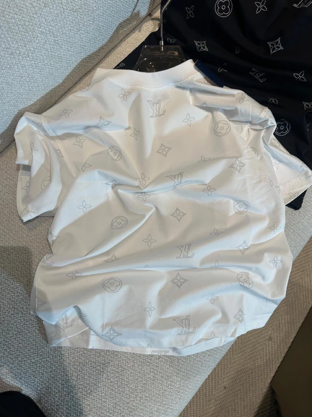 Set of two Louis Vuitton t-shirts. Features the brand's classic monogram pattern in a silver-tone print. Perfect for adding a touch of luxury to your everyday wear!