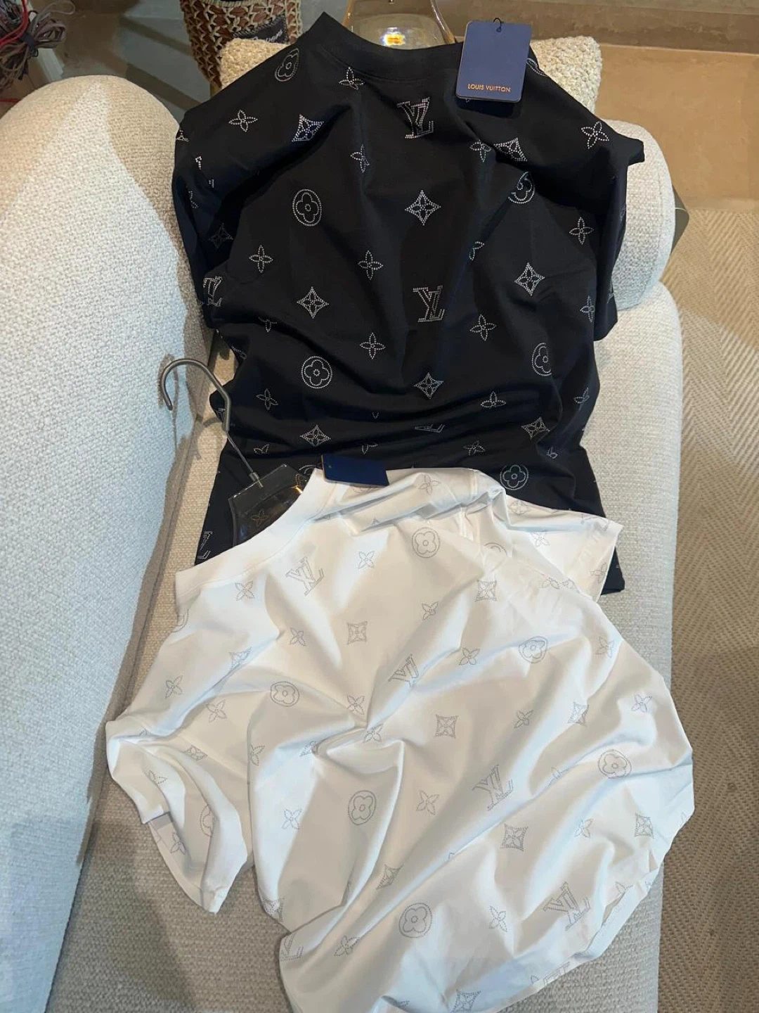Set of two Louis Vuitton t-shirts. Features the brand's classic monogram pattern in a silver-tone print. Perfect for adding a touch of luxury to your everyday wear!