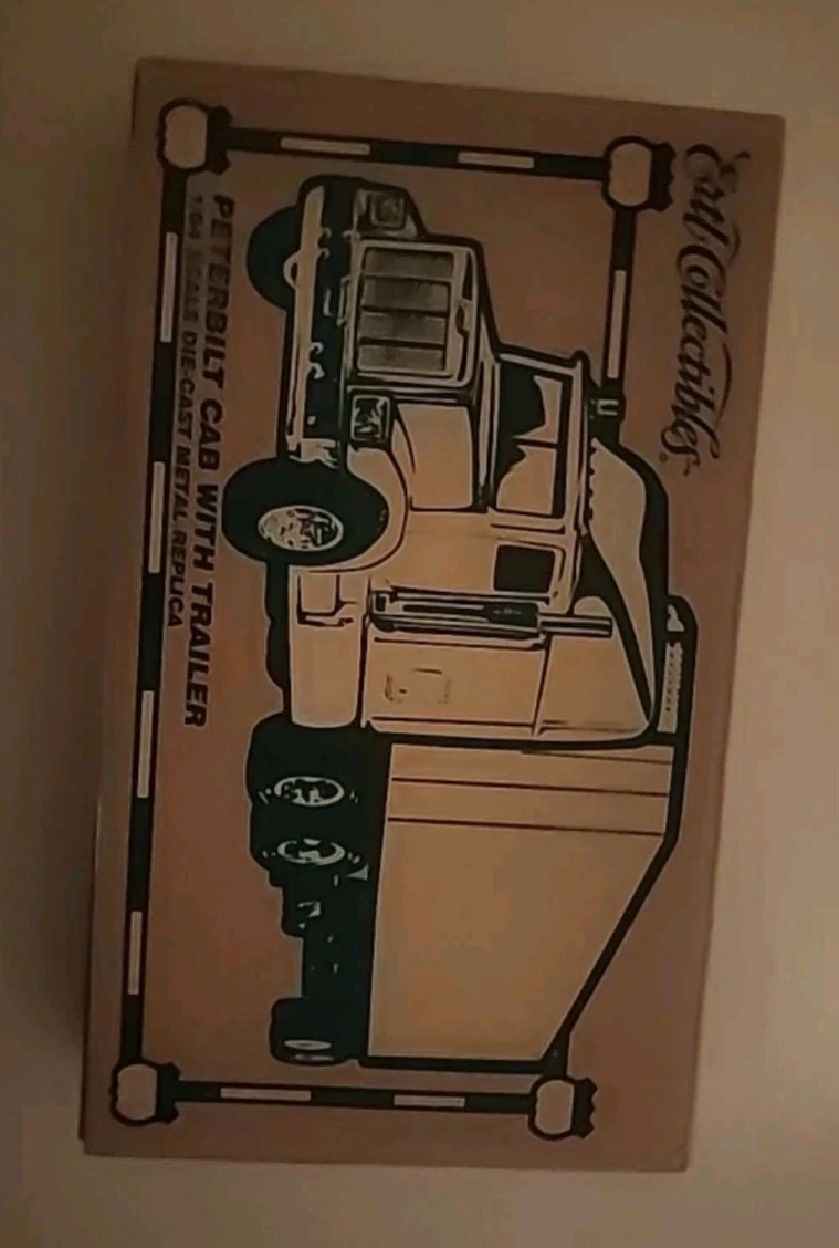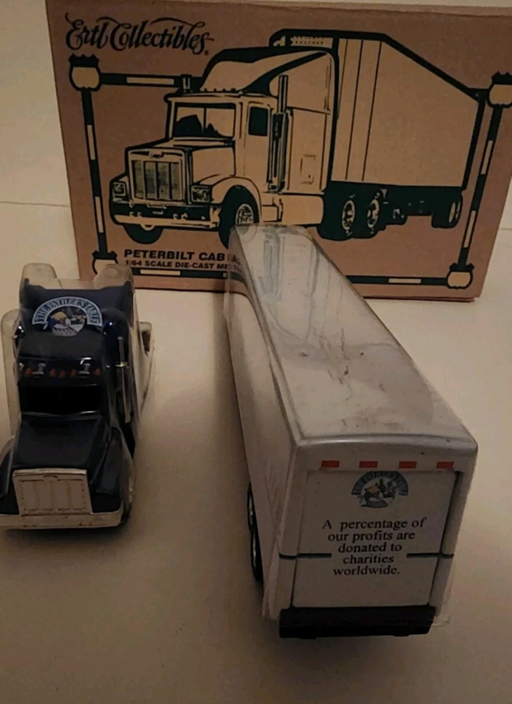 This is an Ertl Collectibles Peterbilt die-cast metal replica with a trailer. It's a 1:64 scale model. A percentage of its profits are donated to charities worldwide.