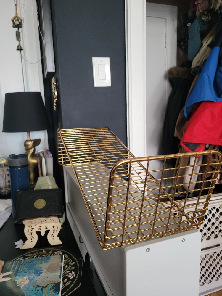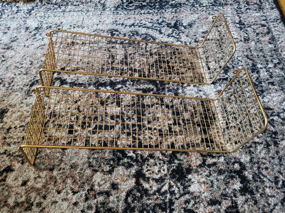 Gold wire shelf with a flat base and curved sides. Great for storage or display. I have 2 for sale. Each shelf is $10 so $20 for both if you'd like to take both.