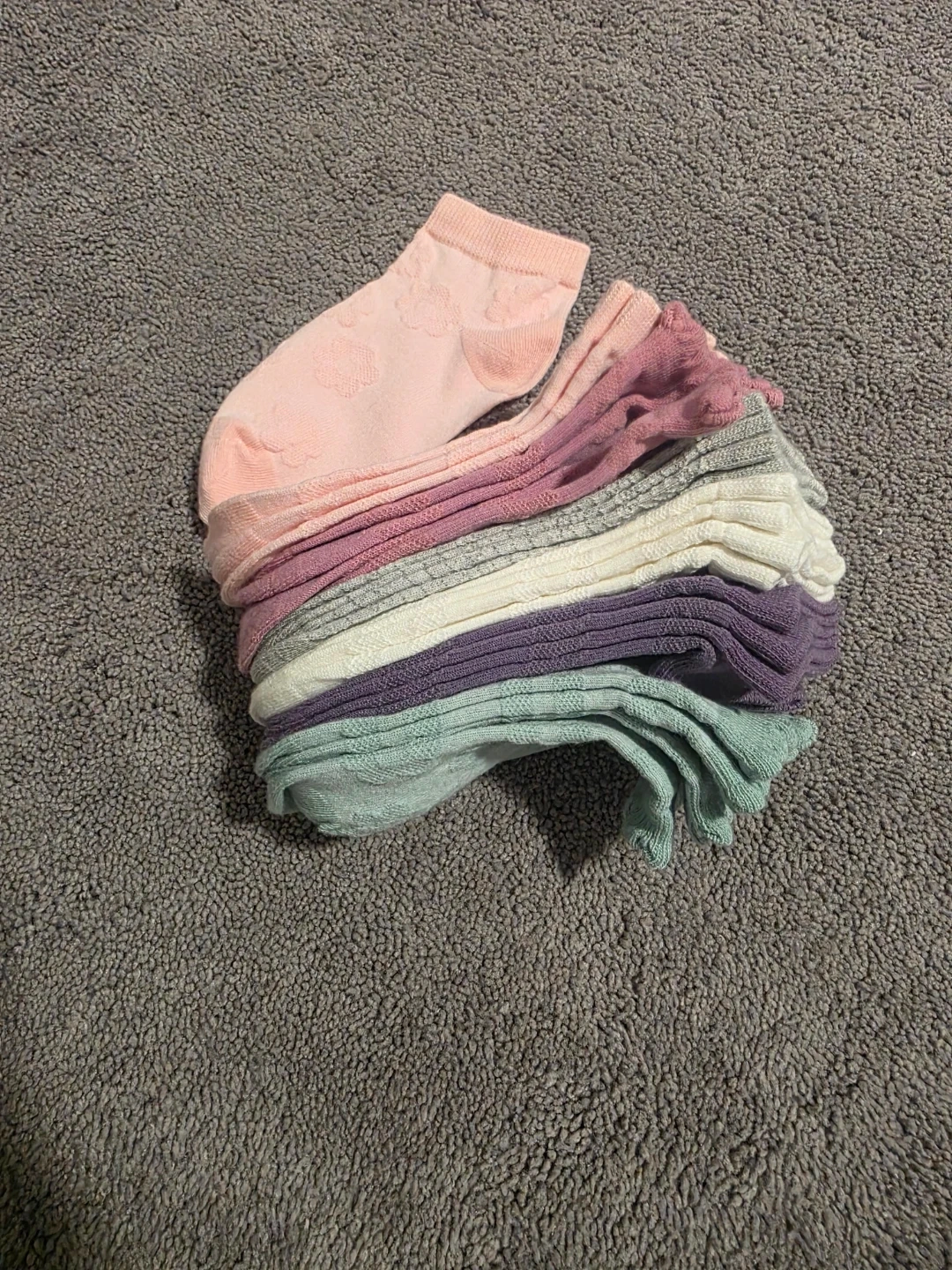 12 pairs of low-cut socks in various colours including pink, purple, white, grey, and mint green. Some socks have a subtle pattern. These are great for everyday wear.