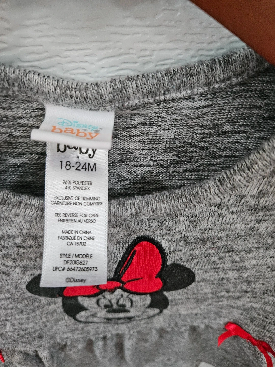 Grey marled tunic top with Minnie Mouse graphic. Made of 96% polyester and 4% spandex. Includes red bow details on the front. Great for toddlers!