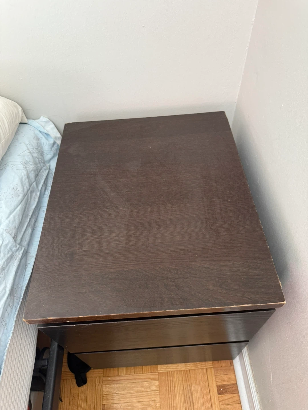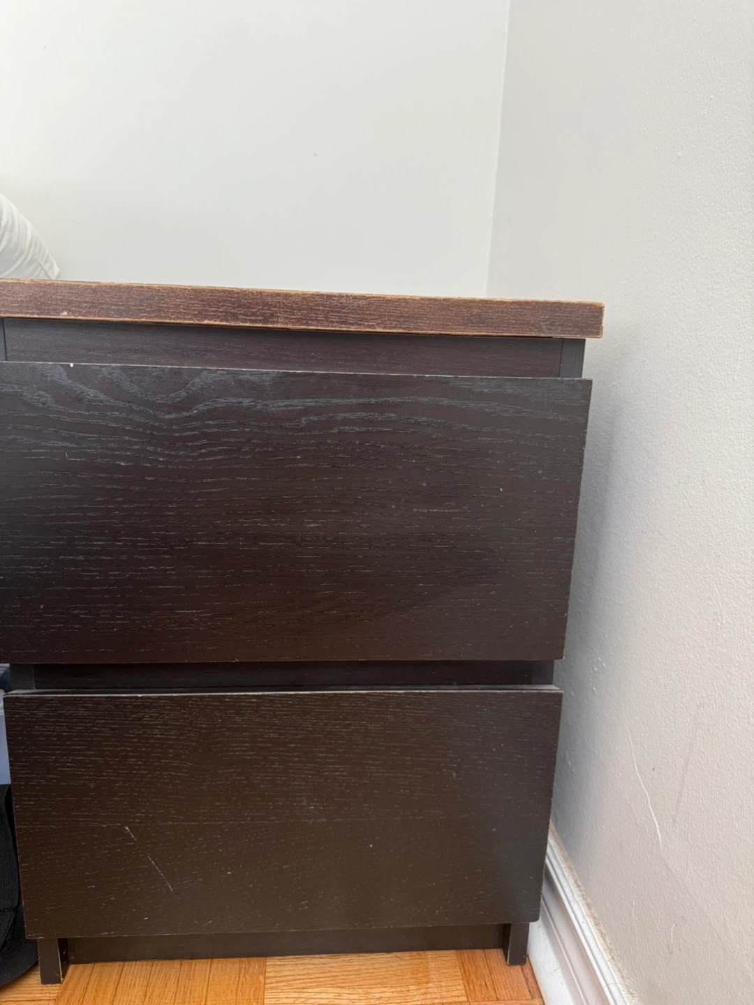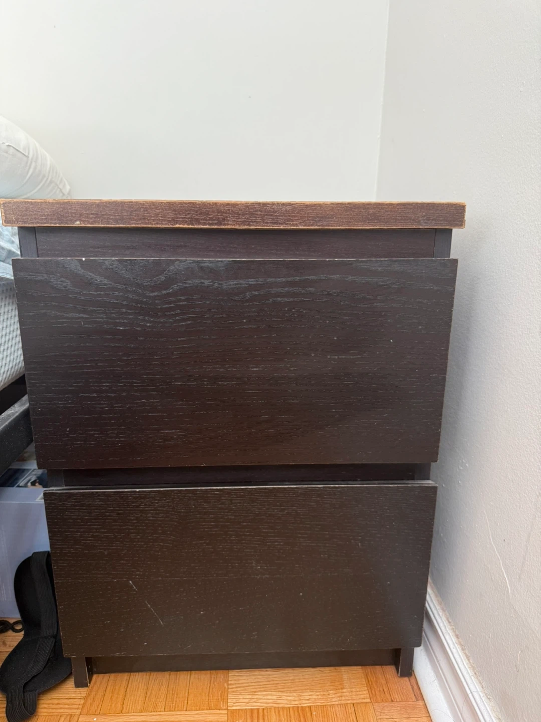 A two-drawer nightstand in a dark brown wood grain finish. Its compact size makes it handy for bedrooms. It's a functional piece for storing bedside essentials.