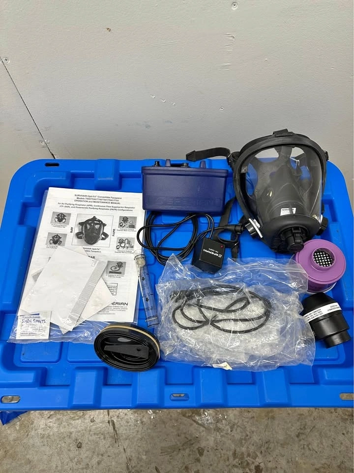 Complete Honeywell / Sperian Survivair Opti-Fit PAPR respirator kit. Includes full face mask, blower with battery, hose, P100 filter, and hard case. Powers on, good used condition.