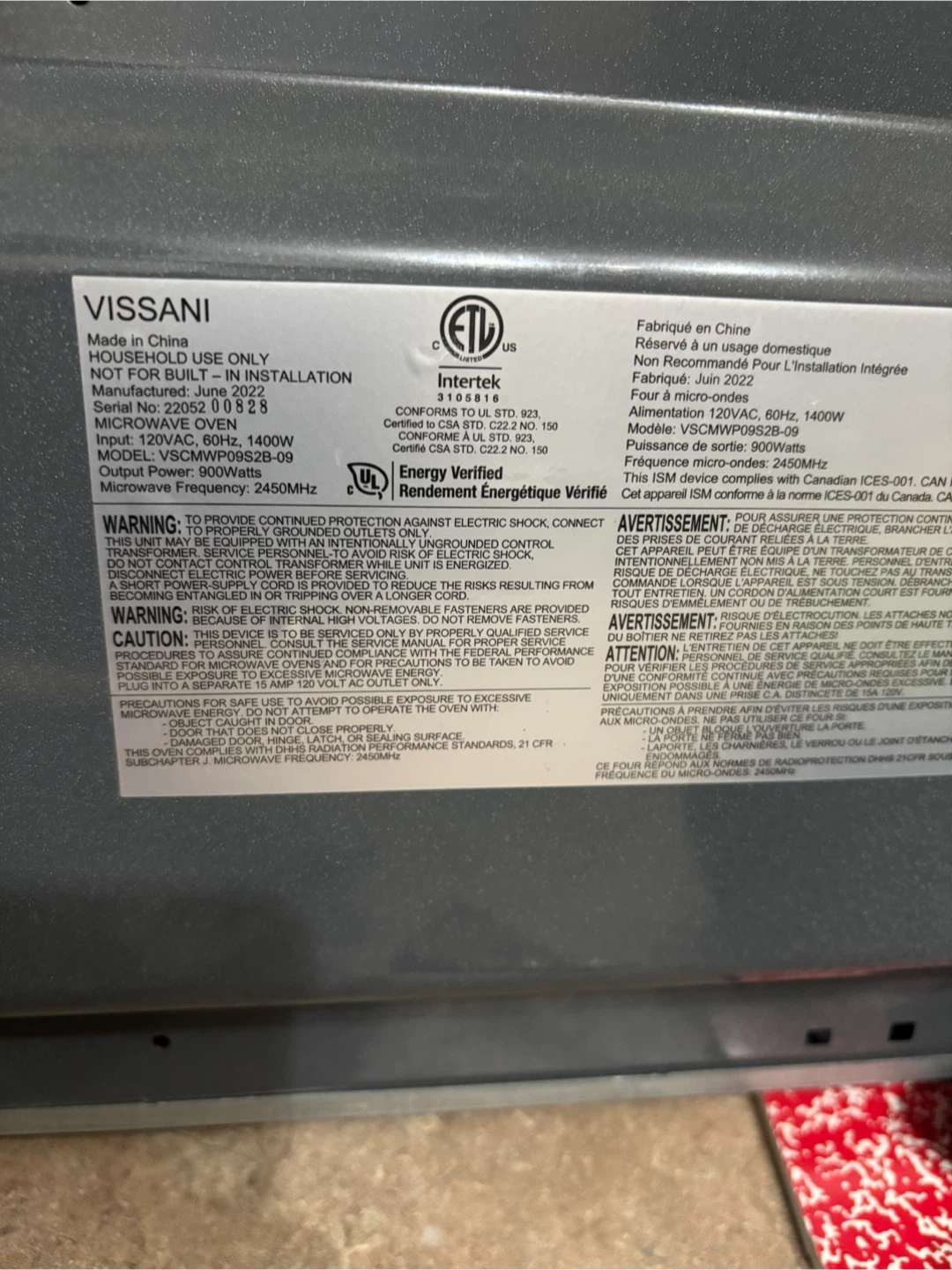 This VISSANI microwave oven is 120V and 1400W. It operates at 2450MHz with 900W microwave frequency. Manufactured in June 2022. Pick up in Terwillegar.