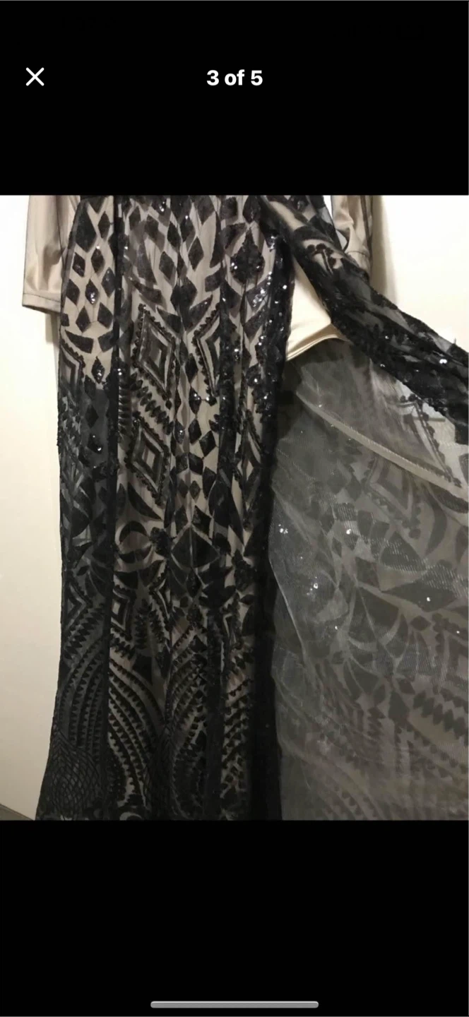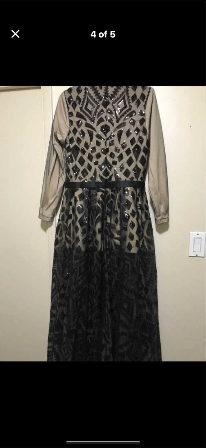 Stunning black sequined formal gown. Features a mesh overlay with intricate sequin patterns and long sleeves. It has a flattering silhouette with a satin belt at the waist. Worn couple hours bought it for 300