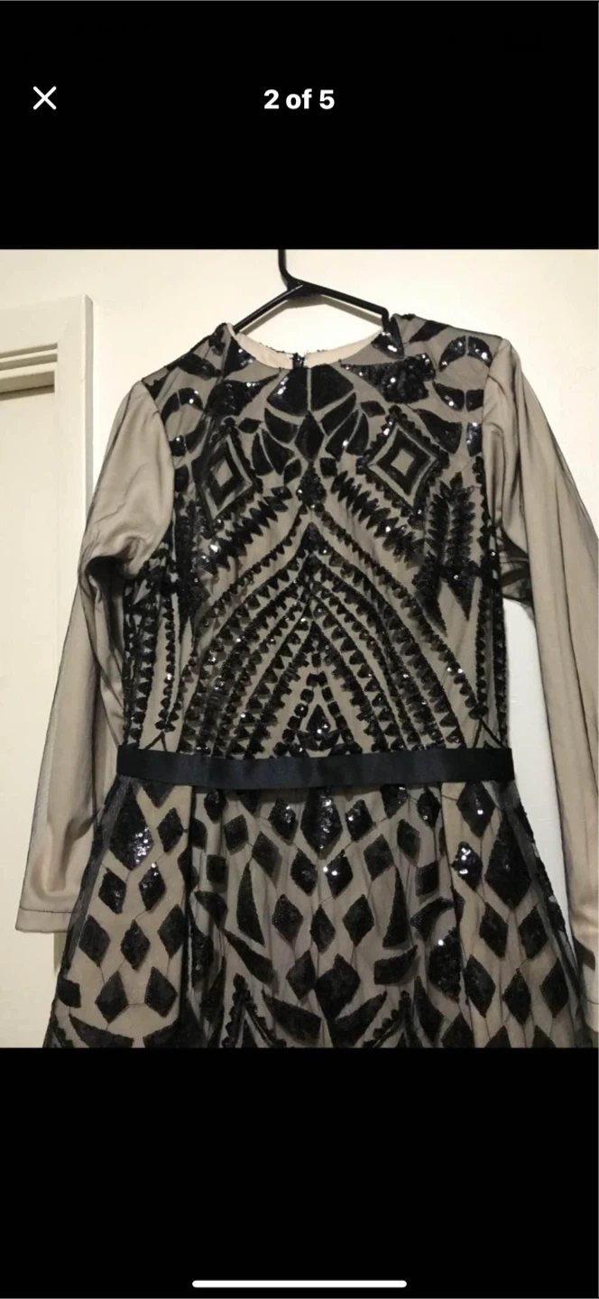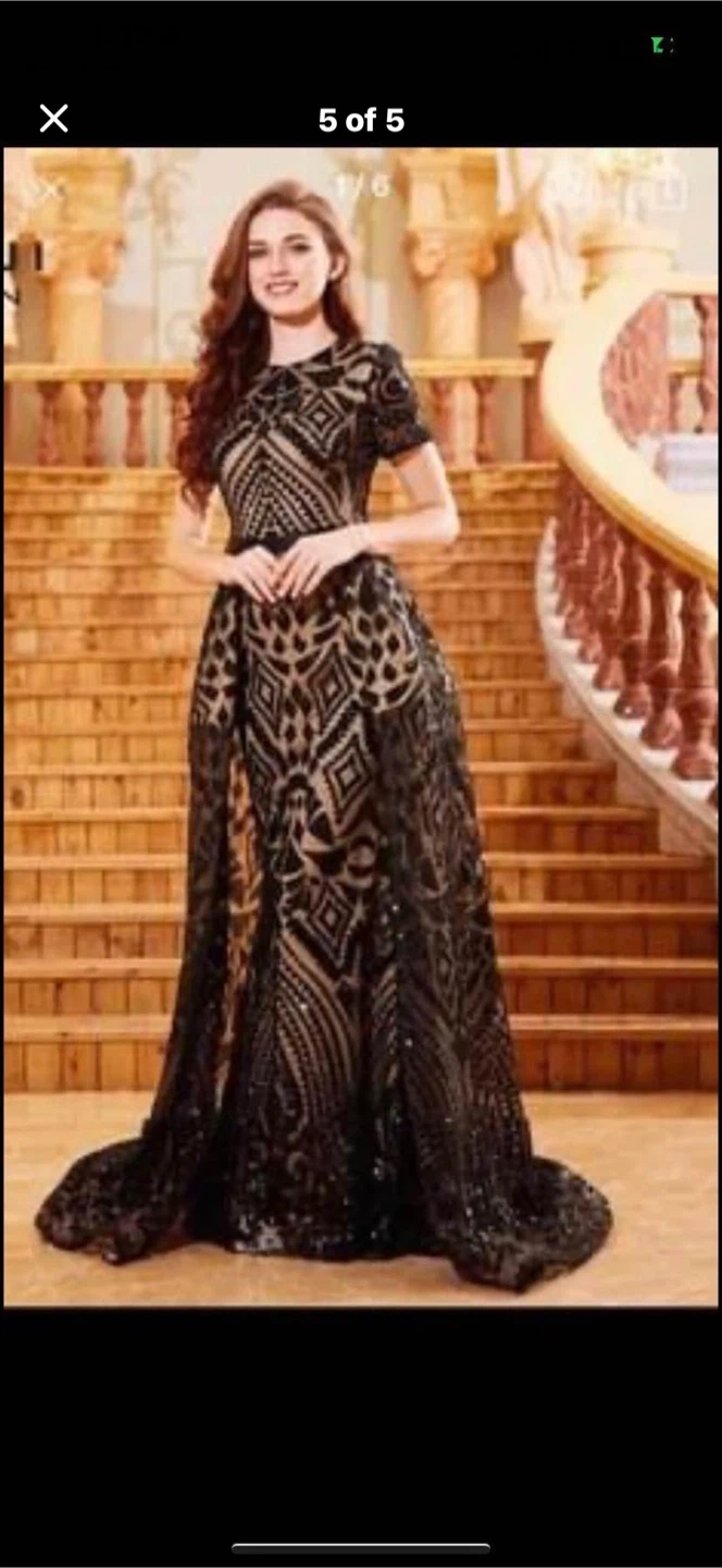 Stunning black sequined formal gown. Features a mesh overlay with intricate sequin patterns and long sleeves. It has a flattering silhouette with a satin belt at the waist. Worn couple hours bought it for 300