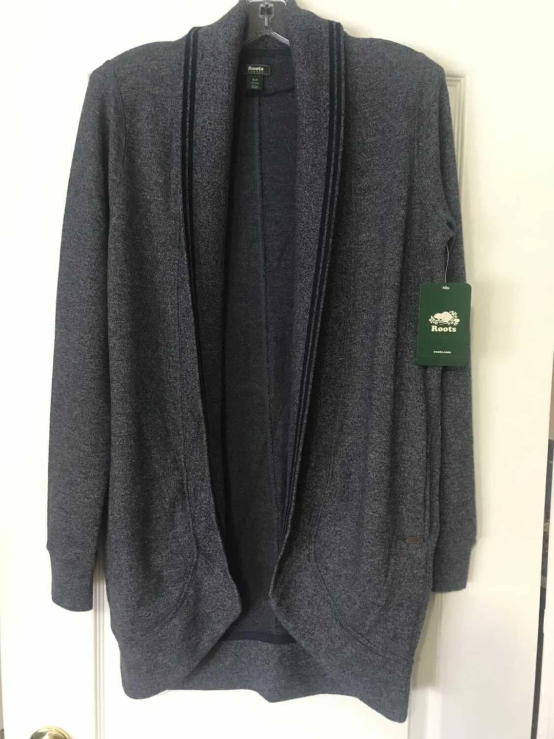 This is a Roots women's cardigan in a charcoal blue marled knit. It's an open-front style with shawl lapels and ribbed trim along the edges. It has two front pockets and falls to hip length.