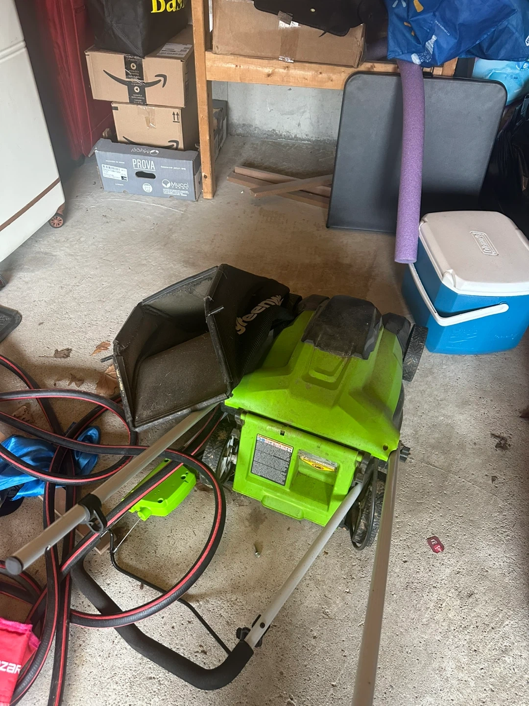 This Greenworks electric lawn mower is in good condition. It features a grass collection bag. It's a reliable choice for keeping your lawn tidy.