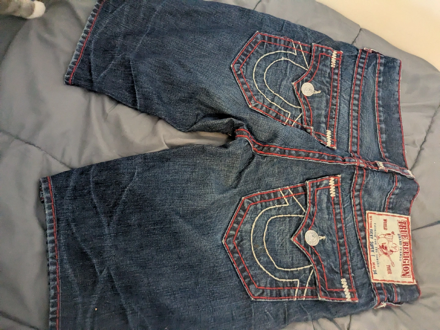 These are a stylish pair of True Religion Ricky Super T denim shorts in seat size 34.