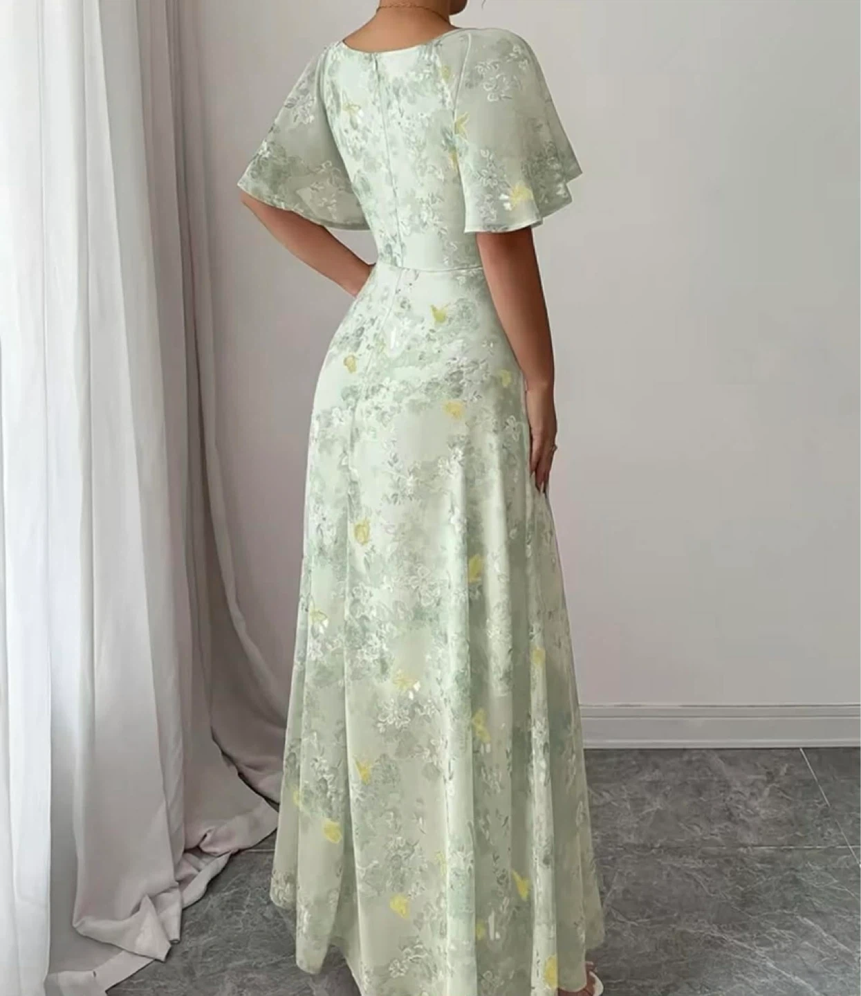 Light green maxi dress with a floral print. Features flutter sleeves and a ruched bodice. Made from a lightweight fabric.